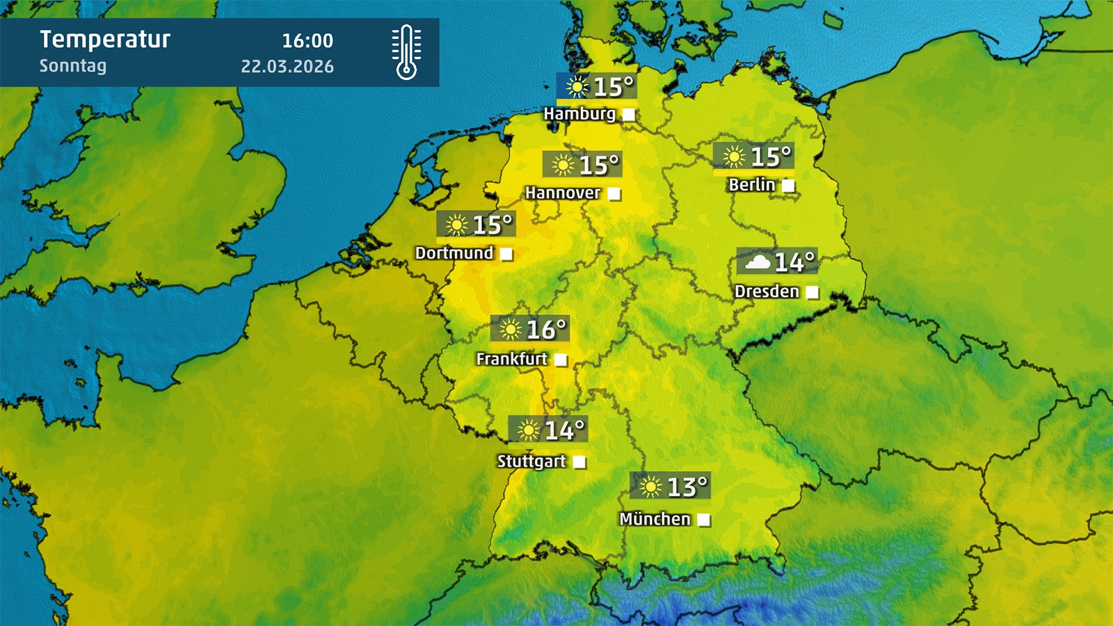 Die Temperaturen zeigen sich wenig frühlingshaft und erreichen im Süden und Norden Werte um oder knapp über 10 Grad. In den östlichen Mittelgebirgen, am Alpenrand sowie im Küstenumfeld bleibt es unter dichten Wolken mit nur 8 Grad als Höchsttemperatur nochmals kühler. Milder wird es im Westen entlang des Rheins mit bis zu 15 Grad – je nach Sonnenschein. In der Mittagssonne fühlt sich das angenehm an, bei aufziehenden Quellwolken jedoch deutlich kühler.