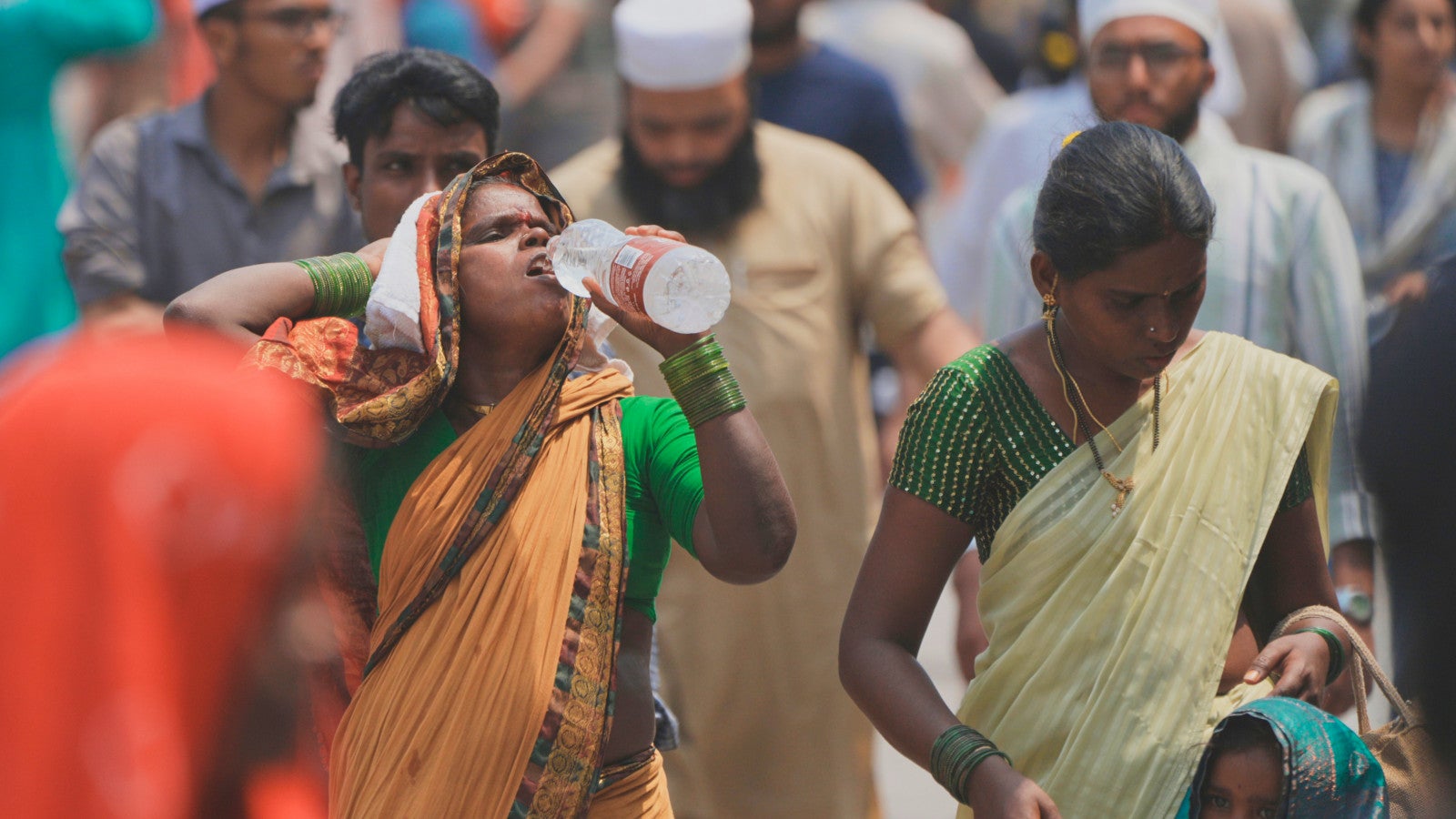 18.04.2025, Indien, Hyderabad: Eine Frau trinkt Wasser aus einer Plastikflasche an dem heißen Tag.