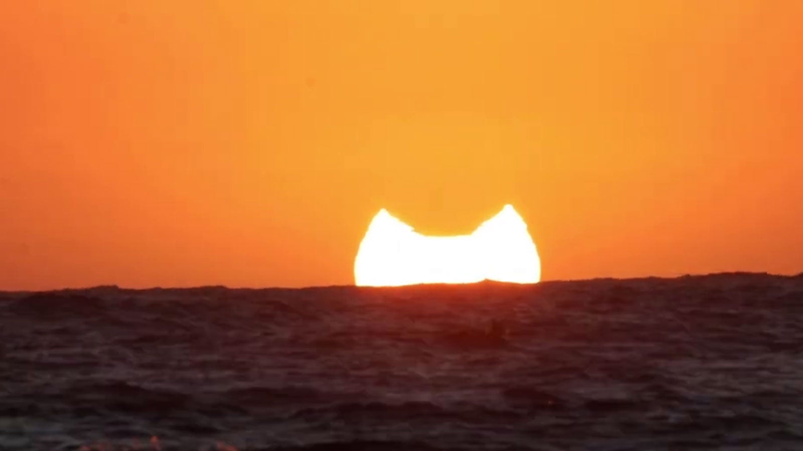 Sehen Sie sich diesen atemberaubenden Sonnenuntergang über Südamerika an. Während die Sonne langsam im Meer versinkt, kam es zeitgleich zu einer partiellen Sonnenfinsternis.