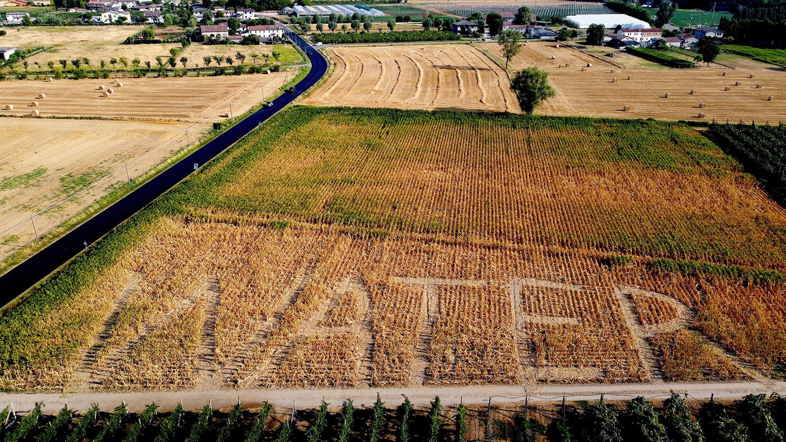 Der Künstler und Landwirt Dario Gambarin hat "Save Water" mit Traktor und Pflug auf ein Feld südöstlich von Verona in Norditalien "gezeichnet".