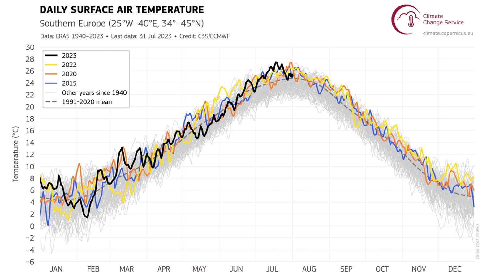 Das Bild zeigt den Temperaturverlauf in Südeuropa zwischen dem 1. Januar 1940 und 23. Juli 2023. Die Temperaturkurve des Rekordjahres 2023 ist schwarz unterlegt. Der bisher zweitwärmste Juli im Jahr 2015 ist blau und der drittwärmste Juli (2022) ist gelb gekennzeichnet.