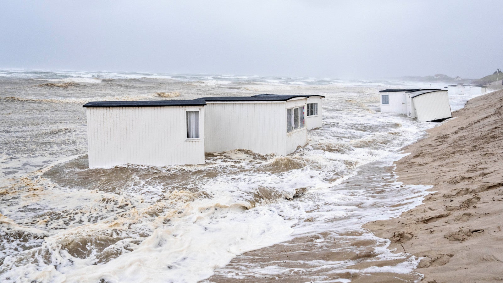 08.08.2023, Dänemark, Loekken: Badehäuser treiben während eines Sturms im Wasser der Nordsee. Ein aufziehendes Unwetter hatte in Skandinavien zu Überschwemmungen, Bränden und Wasserschäden geführt.