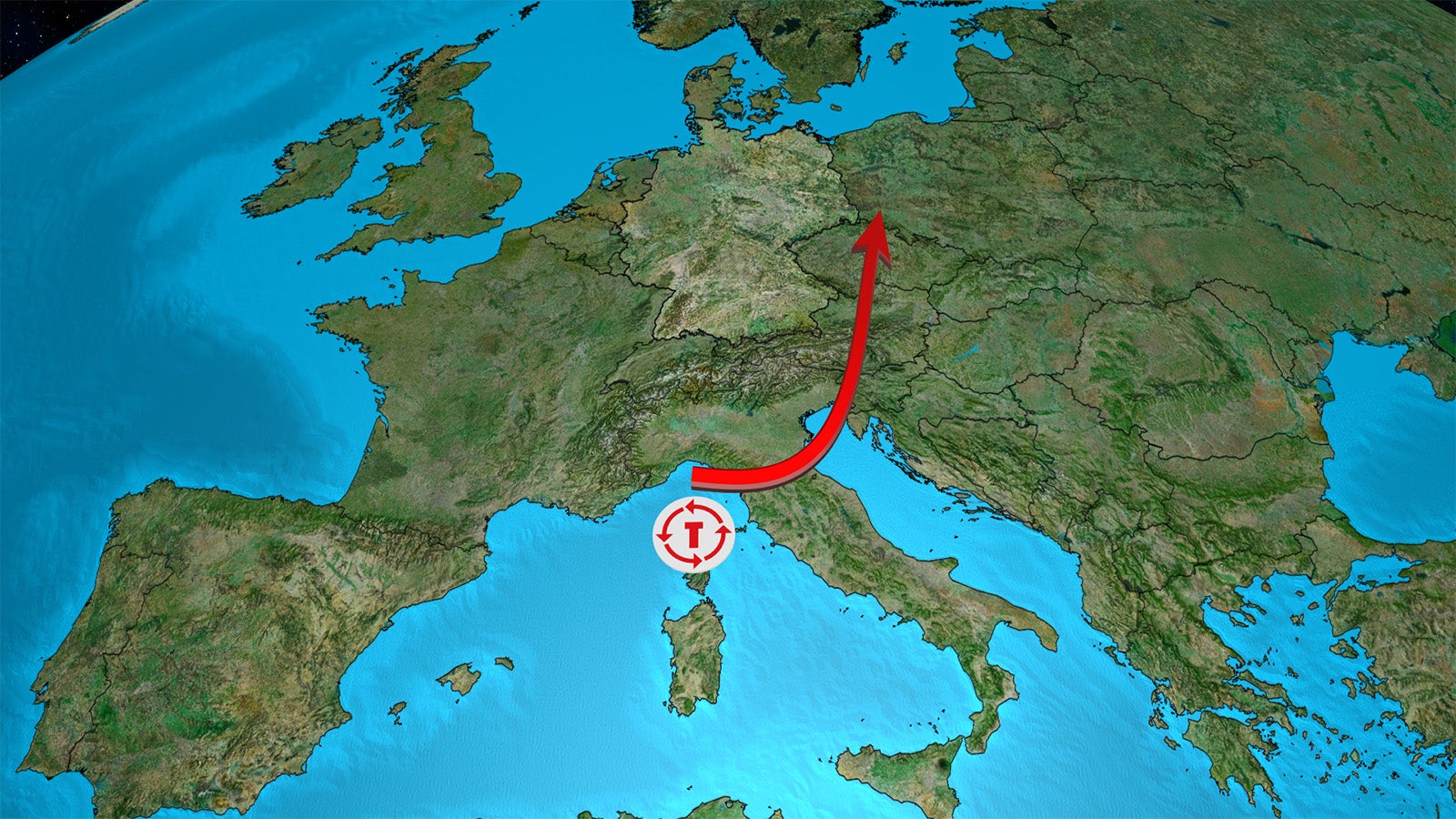 Bei einer sogenannten Vb-Lage zieht ein Tief vom Golf von Genua oder von der nördlichen Adria östlich um die Alpen herum. Diese Wetterlagen sind gefürchtet, da sie häufig sehr viel Niederschlag bedeuten.