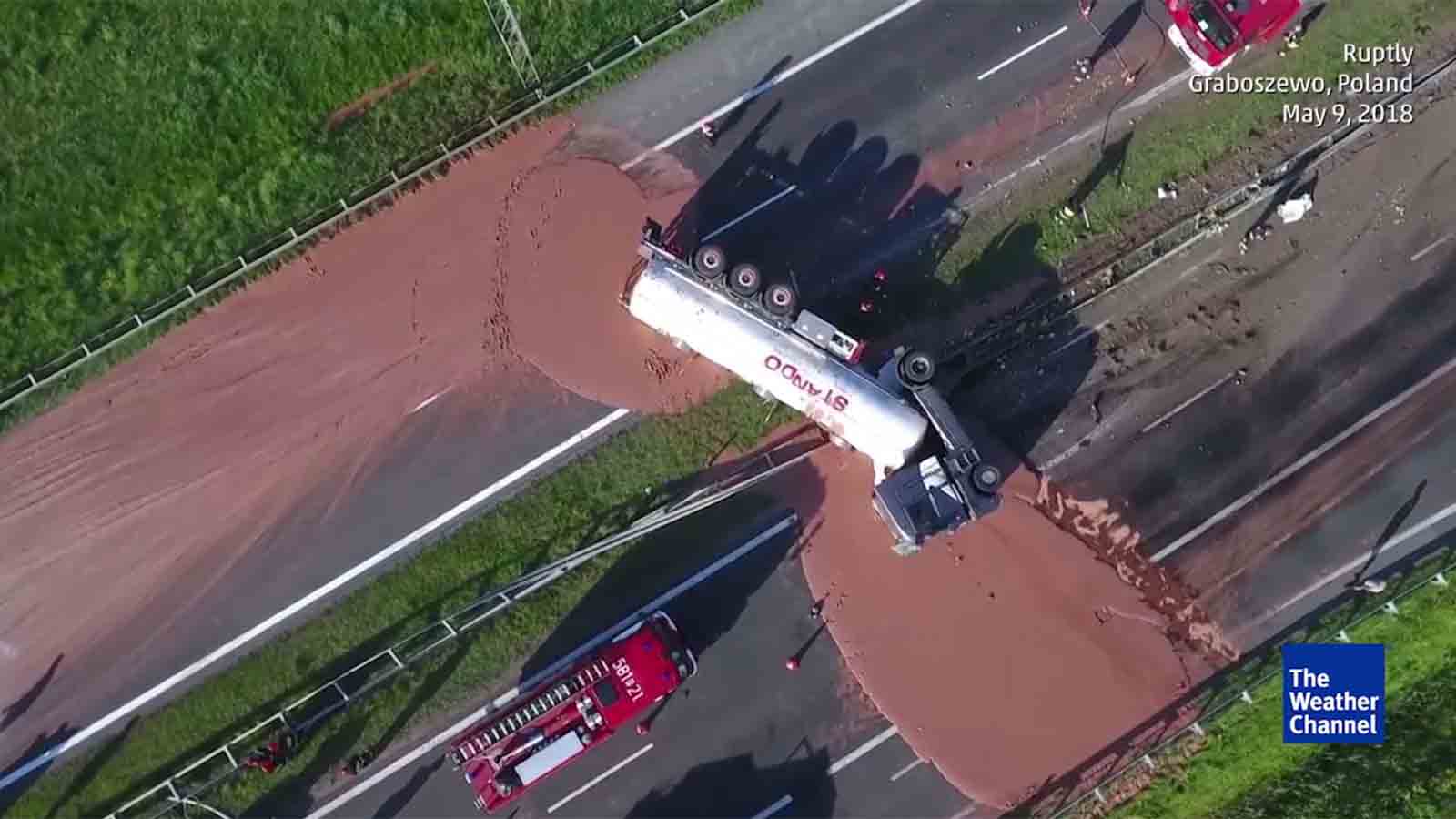 12 Tonnen ausgelaufen: Autobahn nach Unfall komplett in Schokolade getaucht - Videos from The Weather Channel