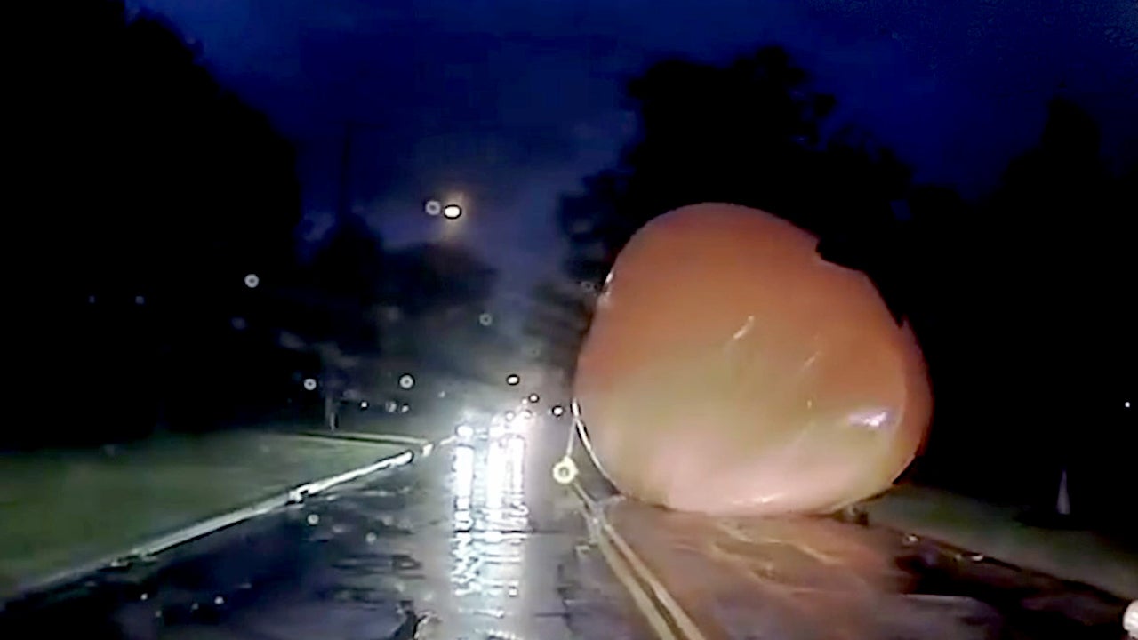 Im US-Bundesstaat Ohio erlebte ein Polizist einen skurrilen Einsatz. In dem Ort Bay Village hatte sich ein Riesenkürbis selbstständig gemacht und den Straßenverkehr behindert. Als der Polizist den Kürbis wegrollen will, verschluckt ihn die überdimensionale Halloween-Deko.