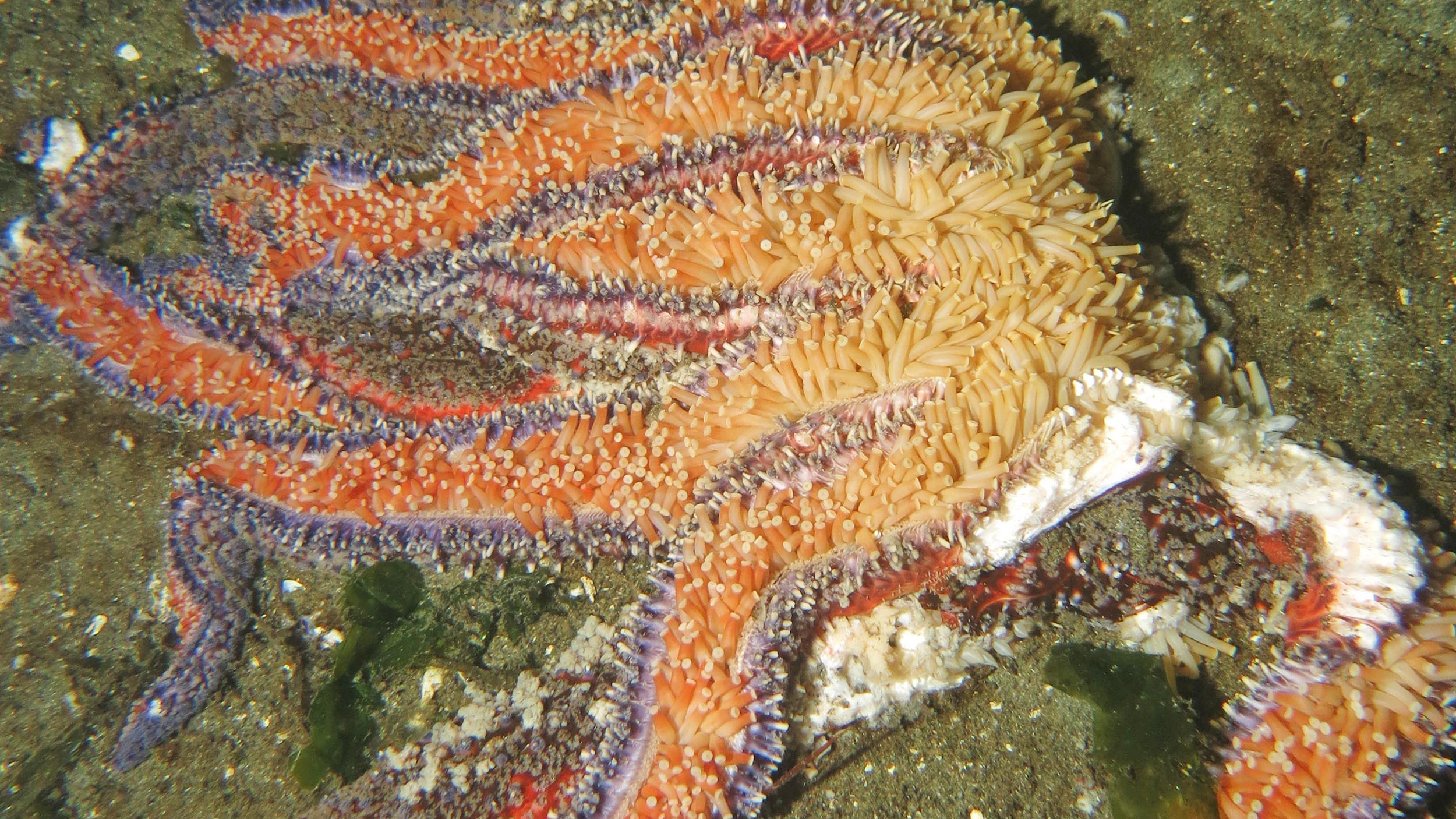 Doch die Population des Sonnenblumen-Seesterns schwindet. Seit 2013 grassiert unter ihnen und unter mehr als 20 weiteren Seesternarten von Mexiko bis Alaska die sogenannte "sea star wasting disease". Diese vermutlich von einem Virus hervorgerufene Krankheit führt bei den Tieren zu Wunden auf der Haut, die Arme zersetzen sich und fallen ab, nach wenigen Tagen sind die Seesterne tot. Während sich einzelne Arten inzwischen erholten, verschwindet der Sonnenblumen-Seestern selbst aus den tieferen Gewässern. Vermutlich gäben Arten, die den Erreger besser tolerierten, die Krankheit an die Sonnenblumen-Seesterne weiter.