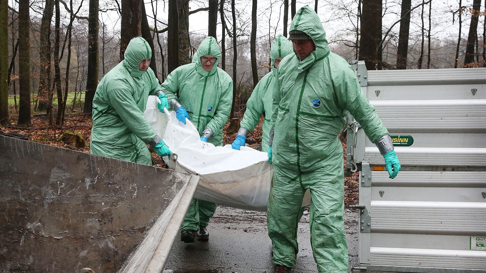 Dieses Bild wurde bei einer Übung bei Düsseldorf aufgenommen. Männer in Schutzanzügen tragen einen gefundenen Kadaver (Dummy) eines vielleicht an Schweinepest verendeten Wildschweins zu einem Container.