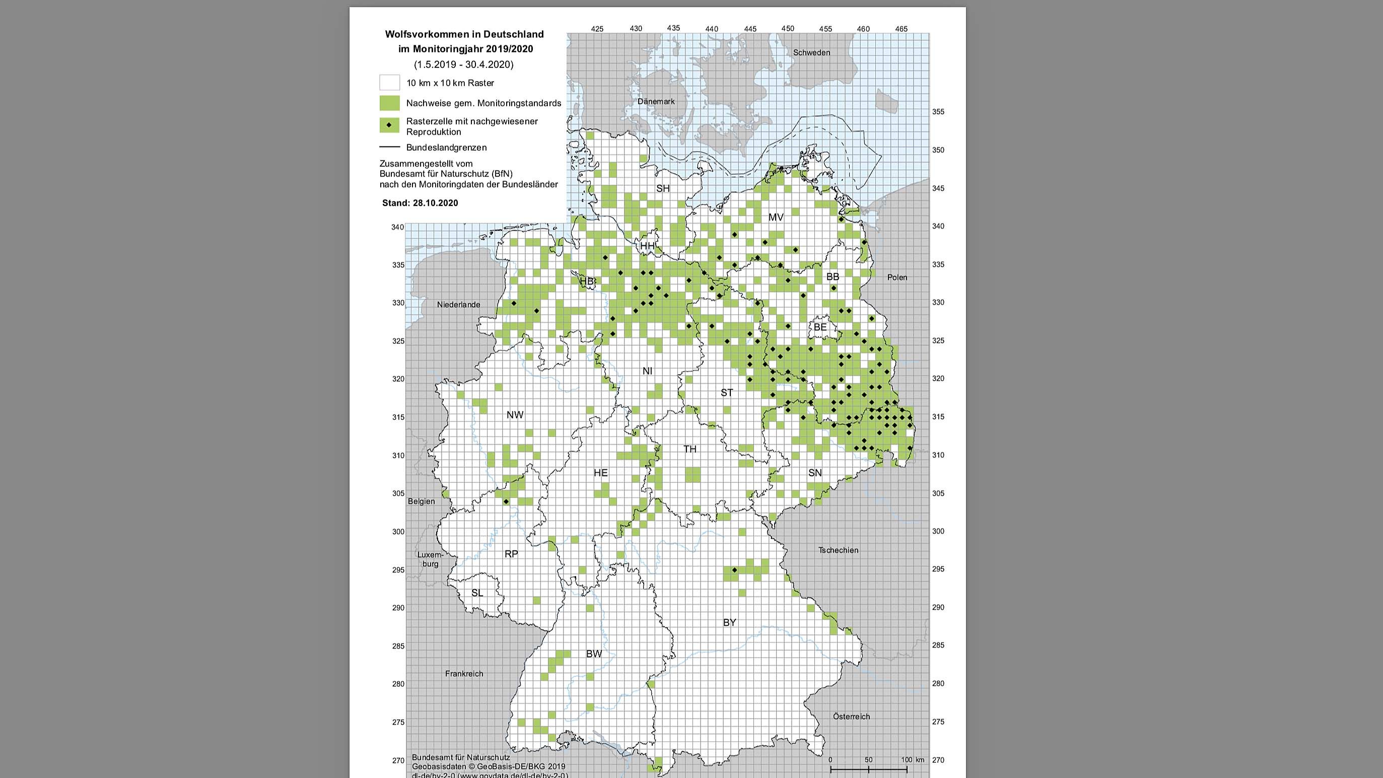Die Karte zeigt in Grün das Wolfsvorkommen am 28.10.20 in Deutschland. Die grünen Zellen mit schwarzen Punkten bedeuten nachgewiesene Reproduktion. (Screenshot)