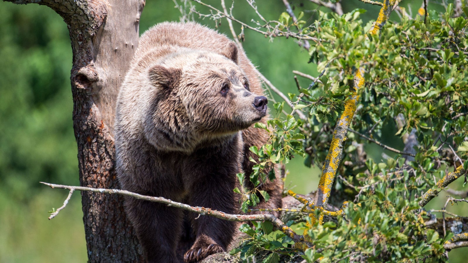 Ein Braunbär klettert im Gehege im Wildpark Poing auf einem Baum.