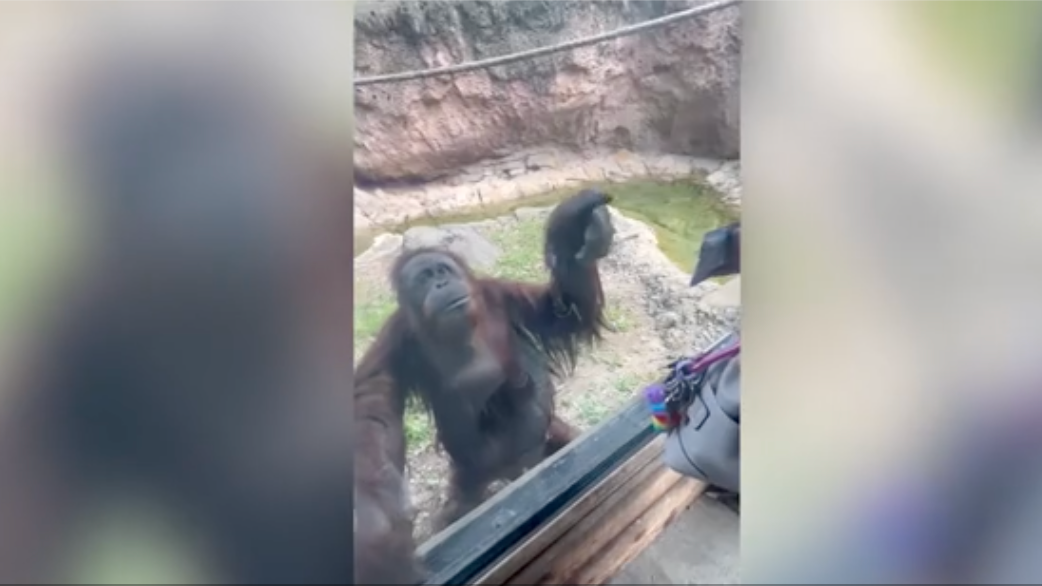 Orang-Utan-Dame Amber ist wahrlich clever! Sie hat beobachtet, dass eine Zoobesucherin Snacks in ihrer Tasche hat. Mit Gesten kommandiert sie sie, zu teilen.