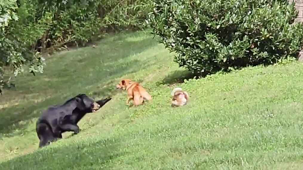 Eine Bärenmutter und ihr Junges sind in Asheville, North Carolina, bei der Nahrungssuche auf zwei Wachhunde gestoßen. Die Bärenmutter schlug mit ihrer Pranke sogar nach den Hunden, um ihr Junges zu beschützen.
