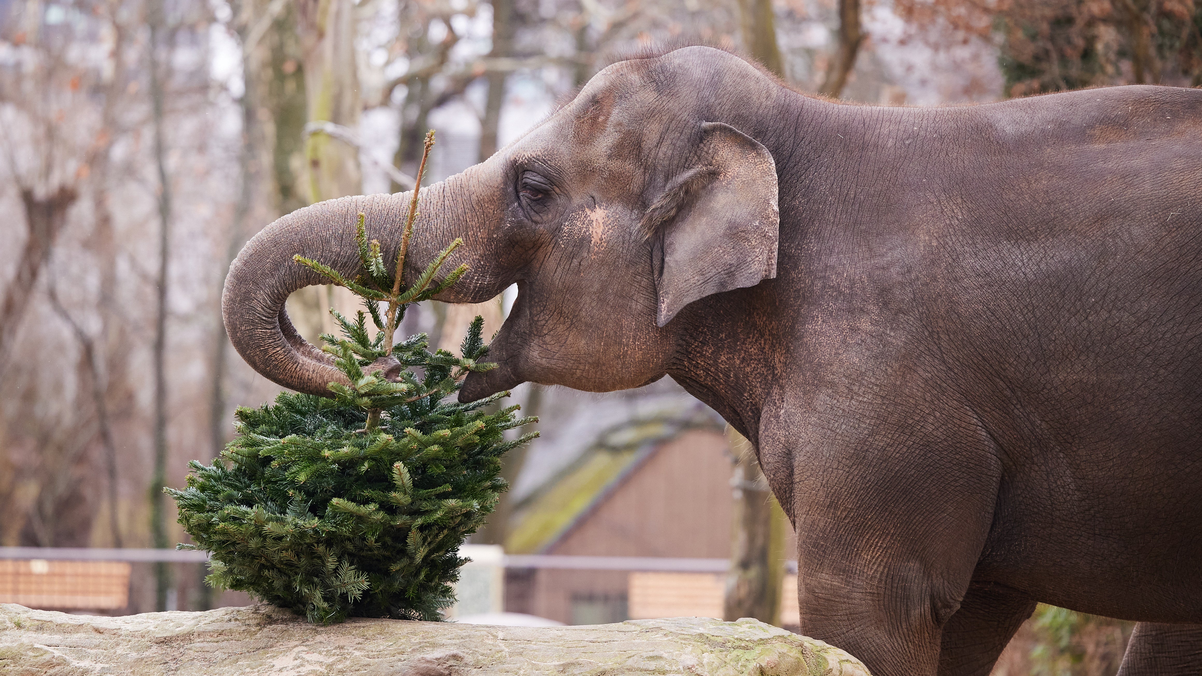 An einigen Straßenecken sammeln sich schon die ausrangierten Weihnachtsbäume. Im Berliner Zoo hingegen stehen sie auf dem Speiseplan.
