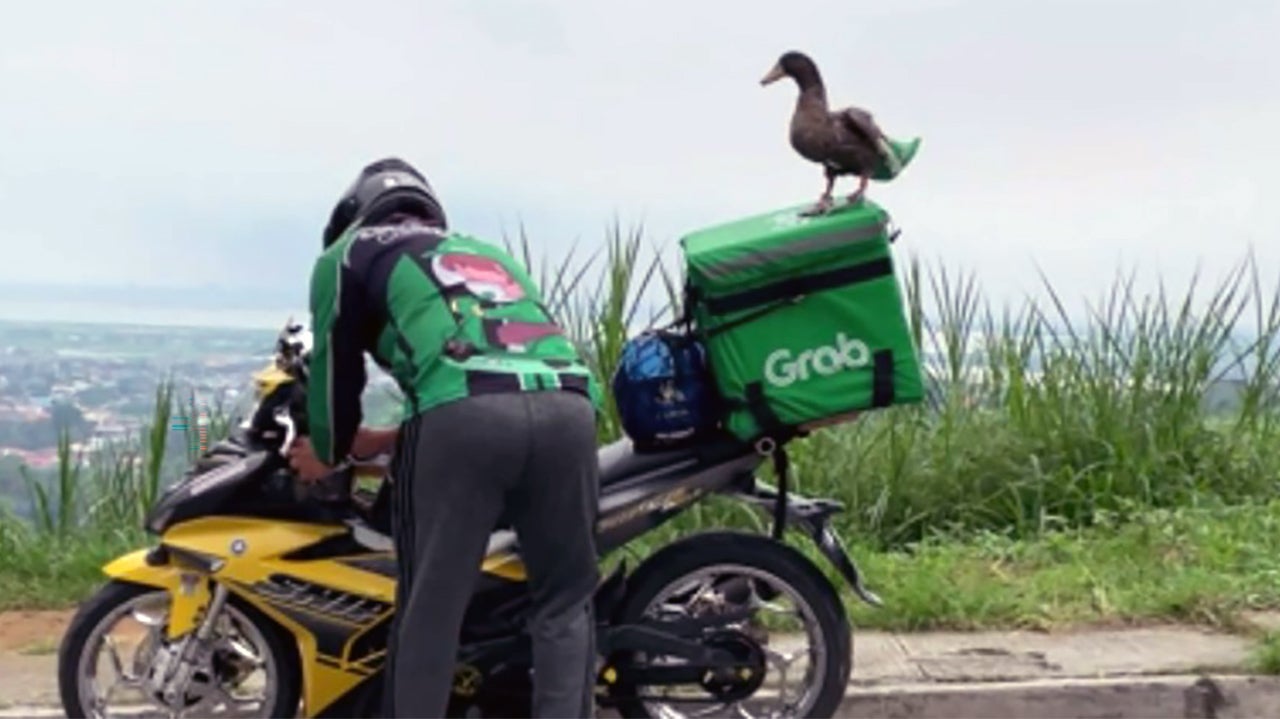 Schon mal eine Ente gesehen, die Essen ausliefert? Kwak Kwak unterstützt ihren Besitzer Christian Navarro Lacson bei der Arbeit als GrabFood-Lieferfahrer. Die "Grab Duck" ist mittlerweile eine Internet-Berühmheit.