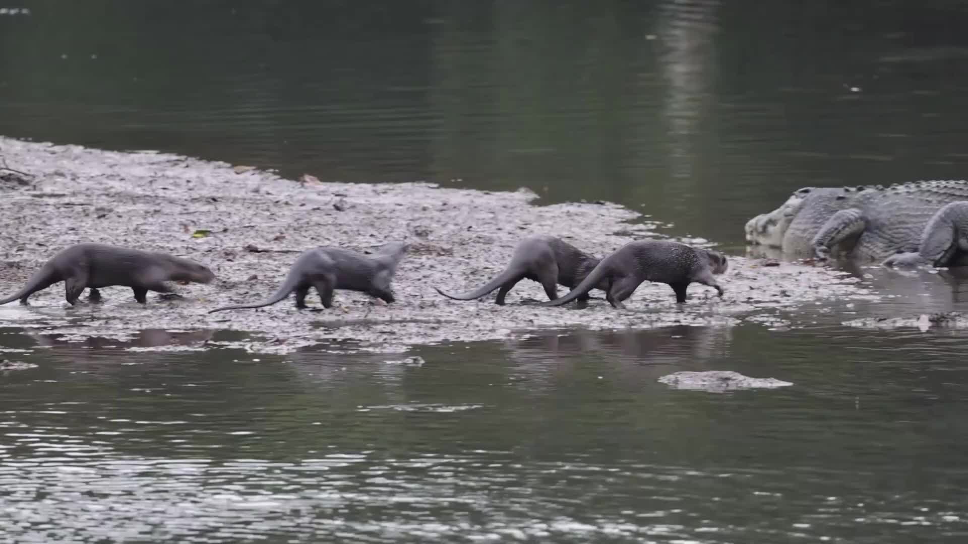 Freche Otter-Gang bringt Krokodil zur Weißglut