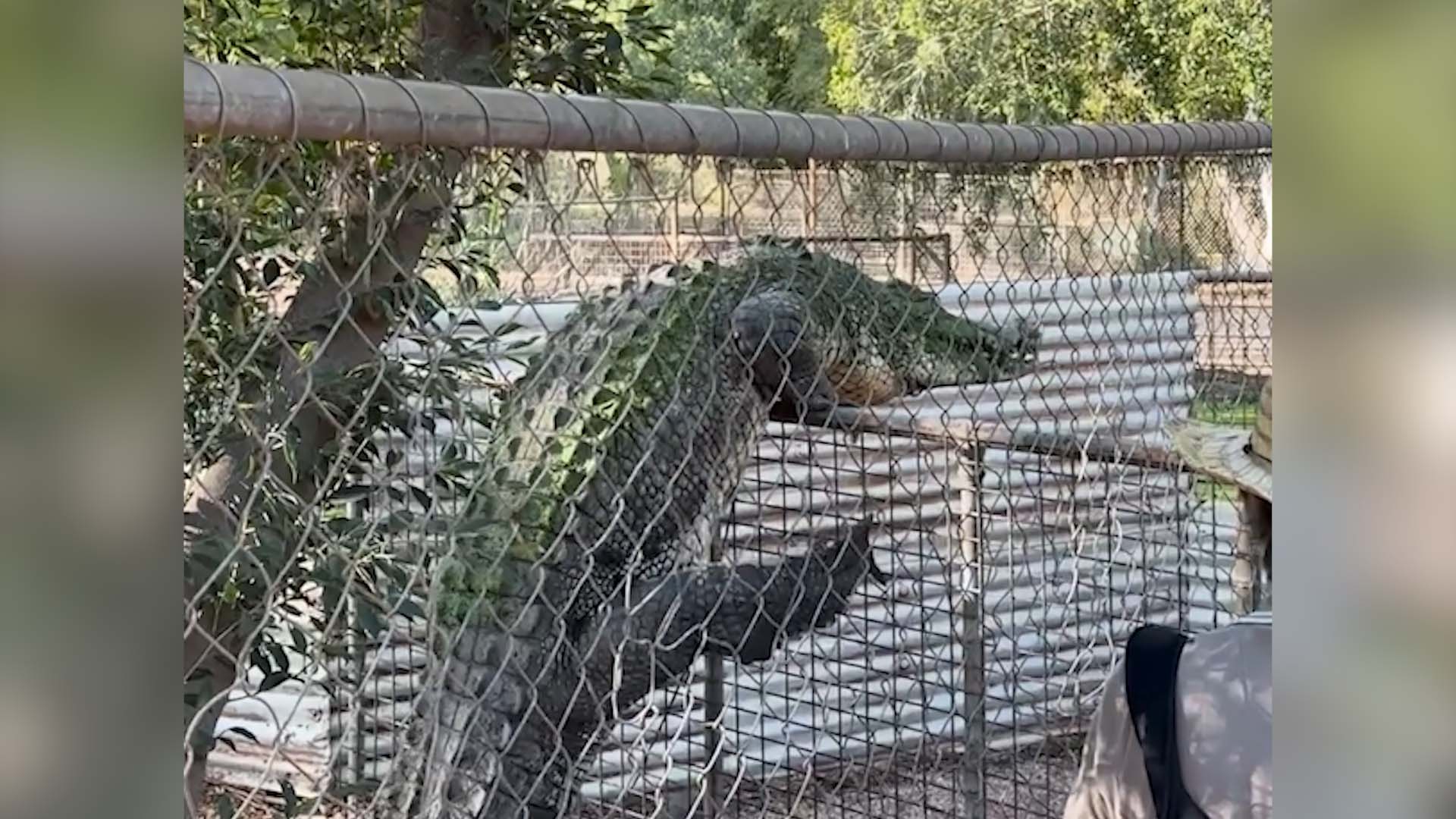 Dieses riesige Krokodil kommt mühelos über den Zaun in einem Wildpark in Australien.