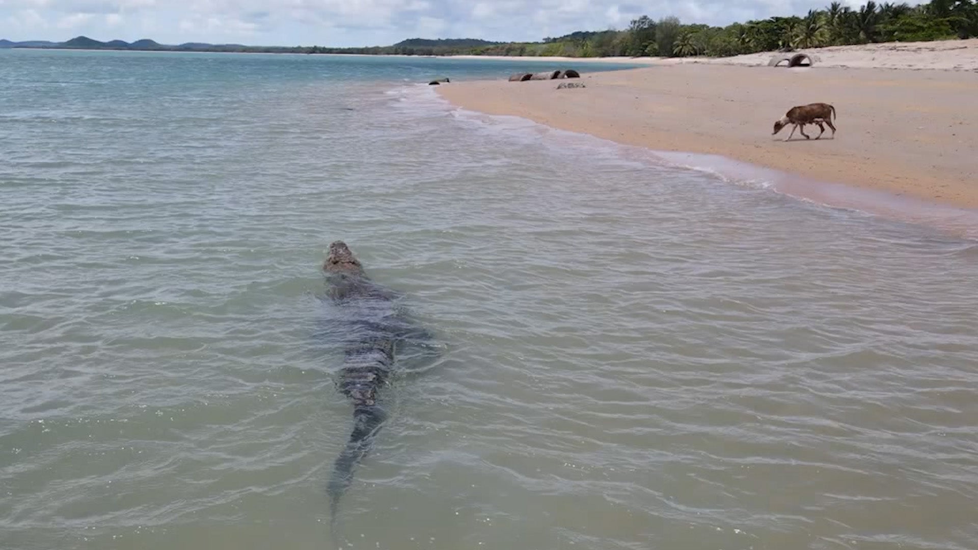 Dieses riesige Krokodil in Australien pirscht sich im Wasser an einen Hund heran. Drohnenaufnahmen zeigen, wie der Hund am Wasser entlang spaziert, während das Krokodil jede seiner Bewegungen verfolgt.