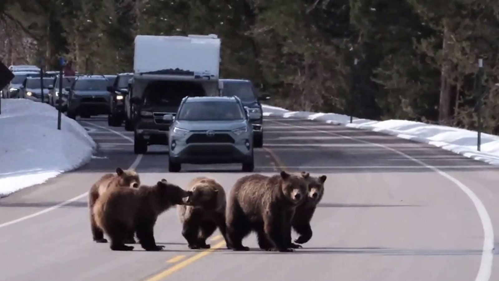 Frisch aus dem Winterschlaf erwacht haben diese Grizzlybären gleich einmal den Verkehr lahmgelegt.
