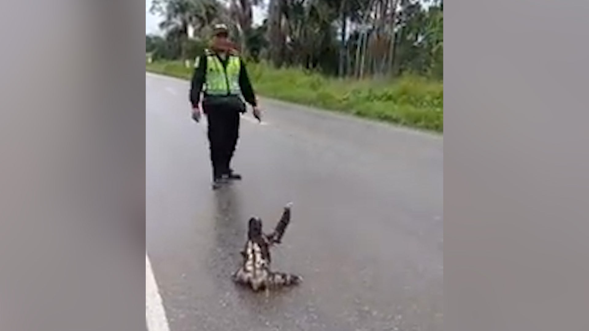 Dieses Faultier versuchte im Regen die Straße zu überqueren und blieb dann aber mitten auf der Straße liegen. Ein Polizist aus Peru konnte den Verkehr noch anhalten, um das Tier zu retten.