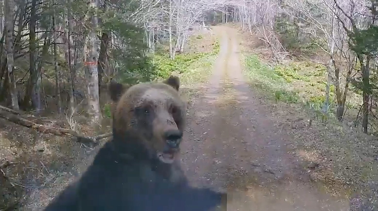 Zwei Männer hatten eine beängstigende Begegnung mit einer Bärenmutter, als sie einen Waldweg in der Nähe von Nemuro, Japan, entlangfuhren.