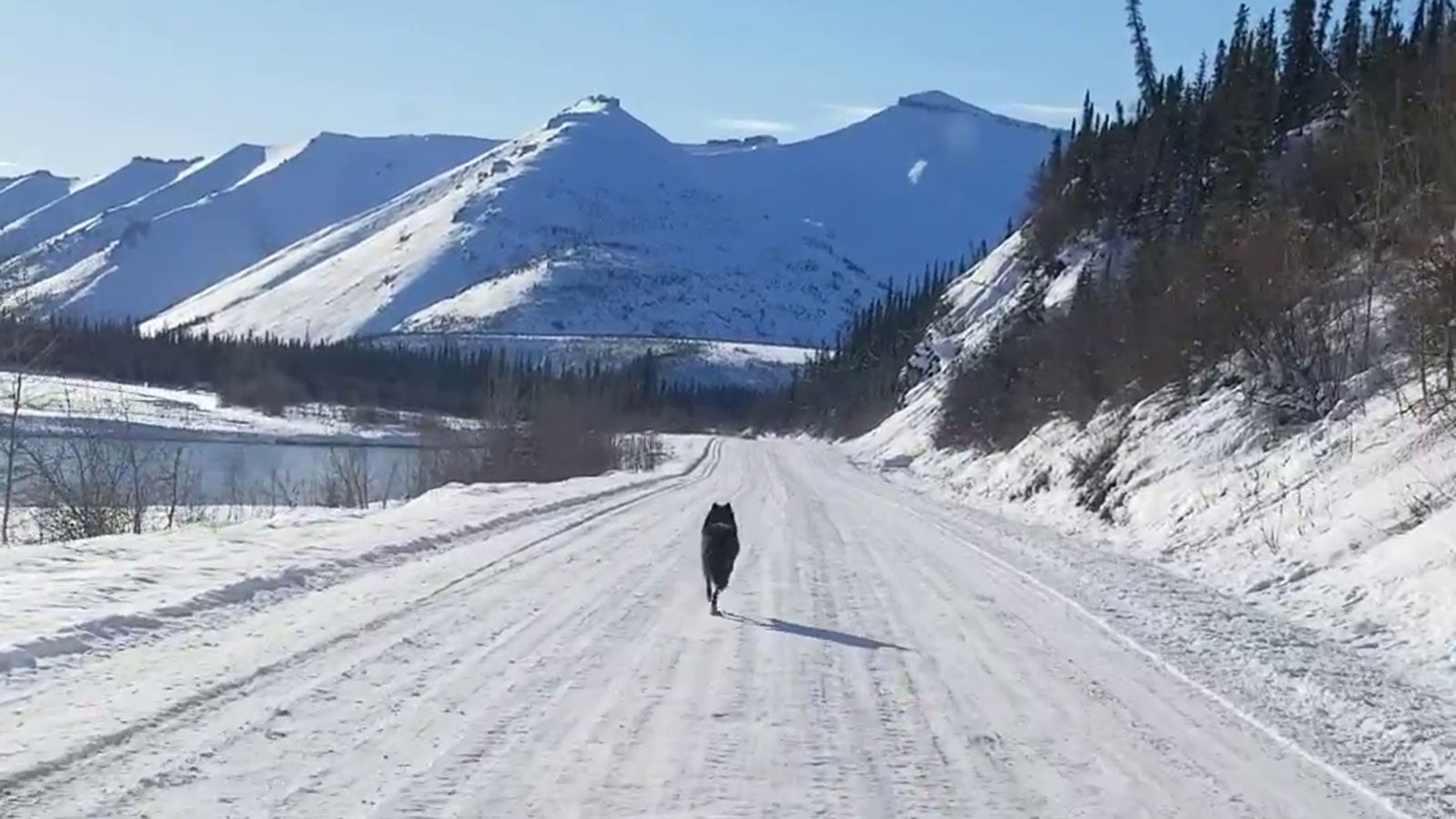 Ein Autofahrer aus Kanada traut seinen Augen nicht. Als er um eine Kurve biegt sieht er plötzlich diesen Wolf auf der Überholspur.