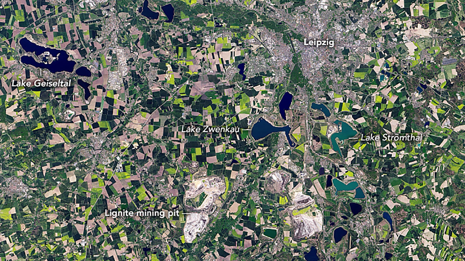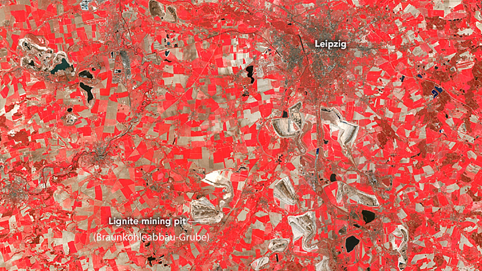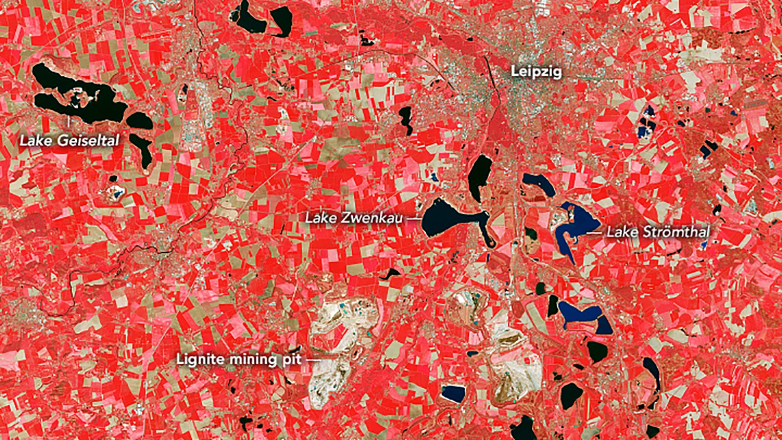 Auf den Satellitenaufnahmen der Nasa ist zuerst das Gebiet um Leipzig am 29. April 1987 zu sehen. Das untere Bild wurde am 23. April 2020 aufgenommen. Es ist deutlich erkennbar, dass im Laufe der drei Jahrzehnte mehrere Seen entstanden sind. Die Aufnahmen enthalten rote und Nahinfrarot erkennbare Farben, um die verschiedenen Komponenten der Landschaft zu unterscheiden. Die Vegetation ist rot, städtische Gebiete hellbraun bis grau.