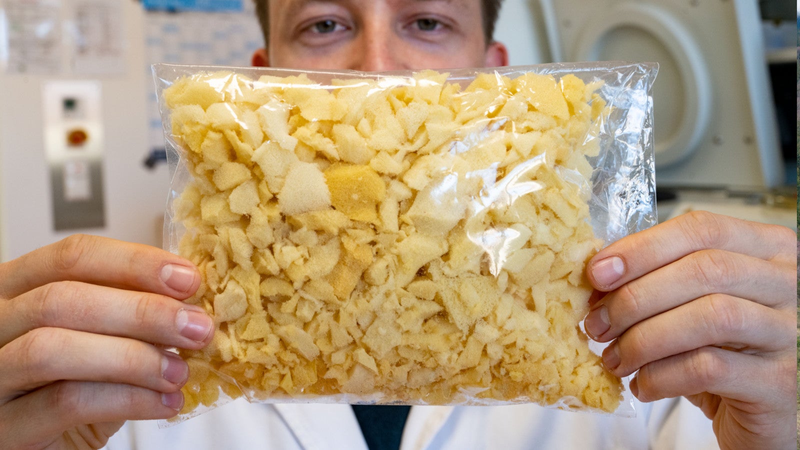 27.02.2023, Mecklenburg-Vorpommern, Greifswald: Yannick Branson vom Institut für Biochemie der Universität Greifswald zeigt Schaumstofffetzen aus einem Sitzkissen. Im Kampf gegen Plastikabfall setzen Forscher vermehrt auf Enzyme, die manche Kunststoffe quasi verdauen können.