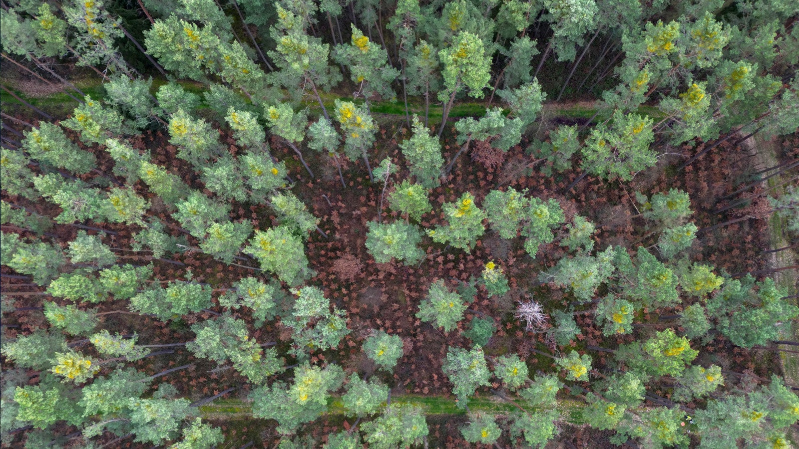 Bayern, Rohr: Viele vor wenigen Jahren gepflanzte Buchen stehen mit braunen Blättern in Bodennähe in einem über die nächsten zwei Jahrzehnte absterbenden Kiefernwald (Aufnahme mit Drohne). Die Buchen sind die die nächste Generation des Waldes. Kiefernwälder, die die Gegend hauptsächlich prägen, haben nach Ansicht von Fachleuten wegen der Klimaerwärmung keine langfristige Überlebenschance.
