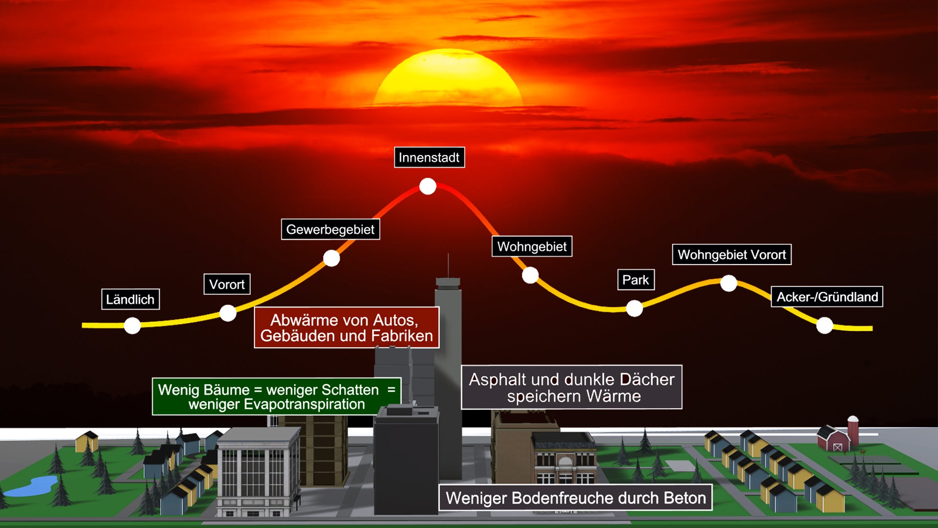 Da viele Städte dicht bebaut sind und gleichzeitig über wenig Grün- und Freiflächen verfügen, heizen sich diese tagsüber stark auf und kühlen teilweise nachts nur wenig ab.