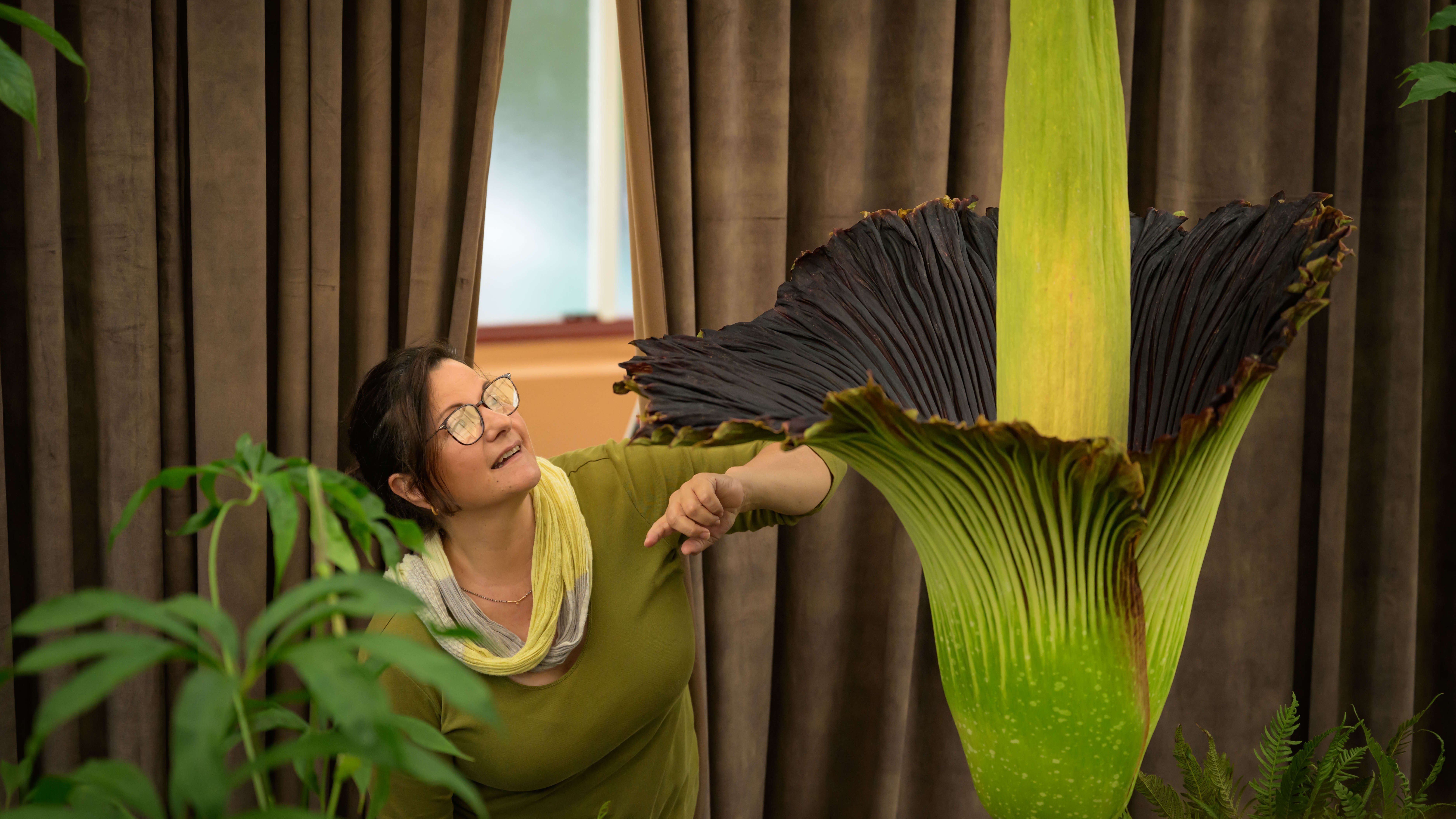 Eine Mitarbeiterin untersucht die Titanwurz.