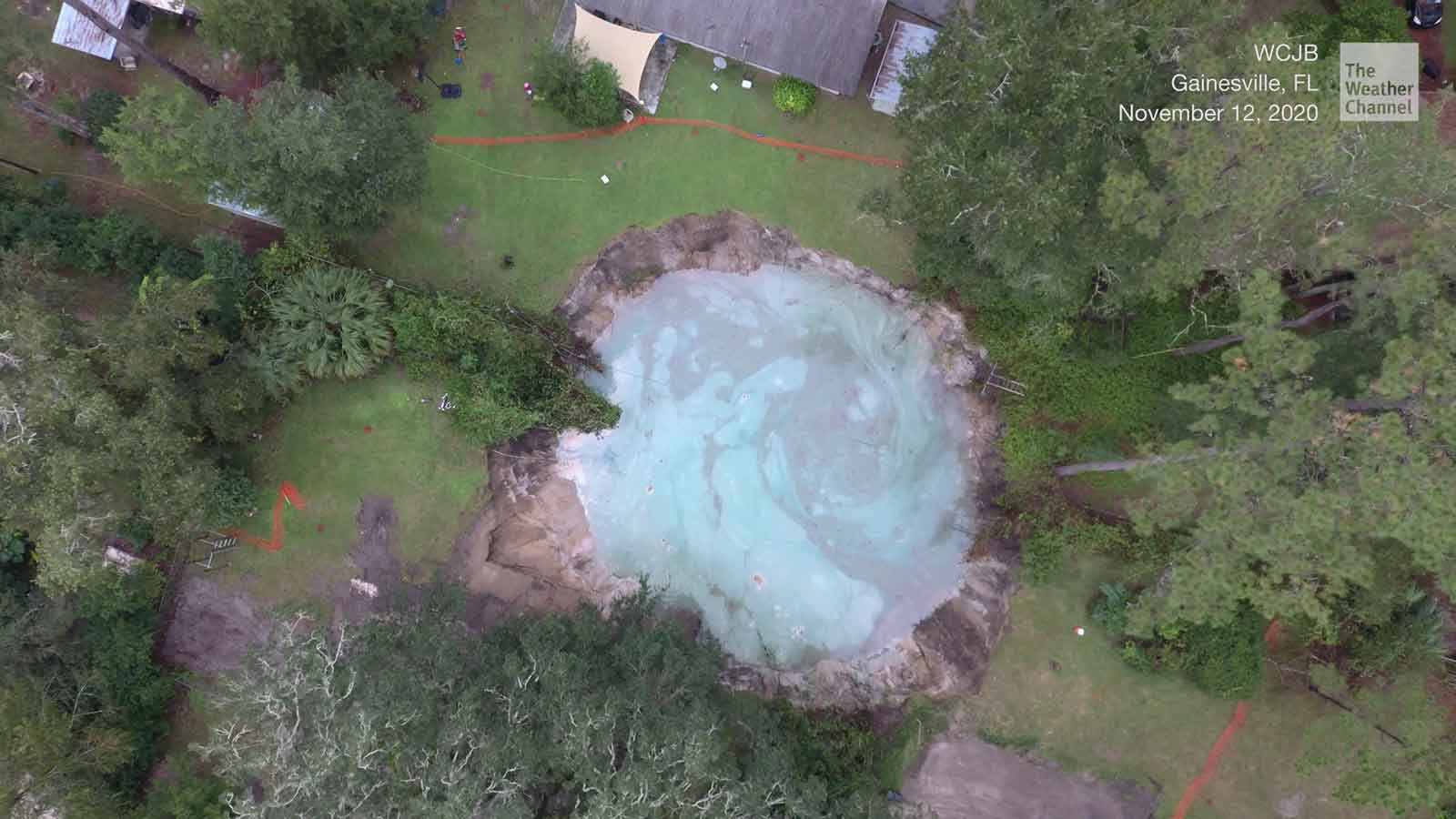 Drohnenaufnahmen zeigen das ganze Ausmaß dieses riesigen Erdlochs in Gainesville, Florida. Das mehr als 30 Meter breite Senkloch hat bereits einen Pool verschluckt, mehrere Familien aus ihren Häusern vertrieben und zwei Gebäude zerstört.
