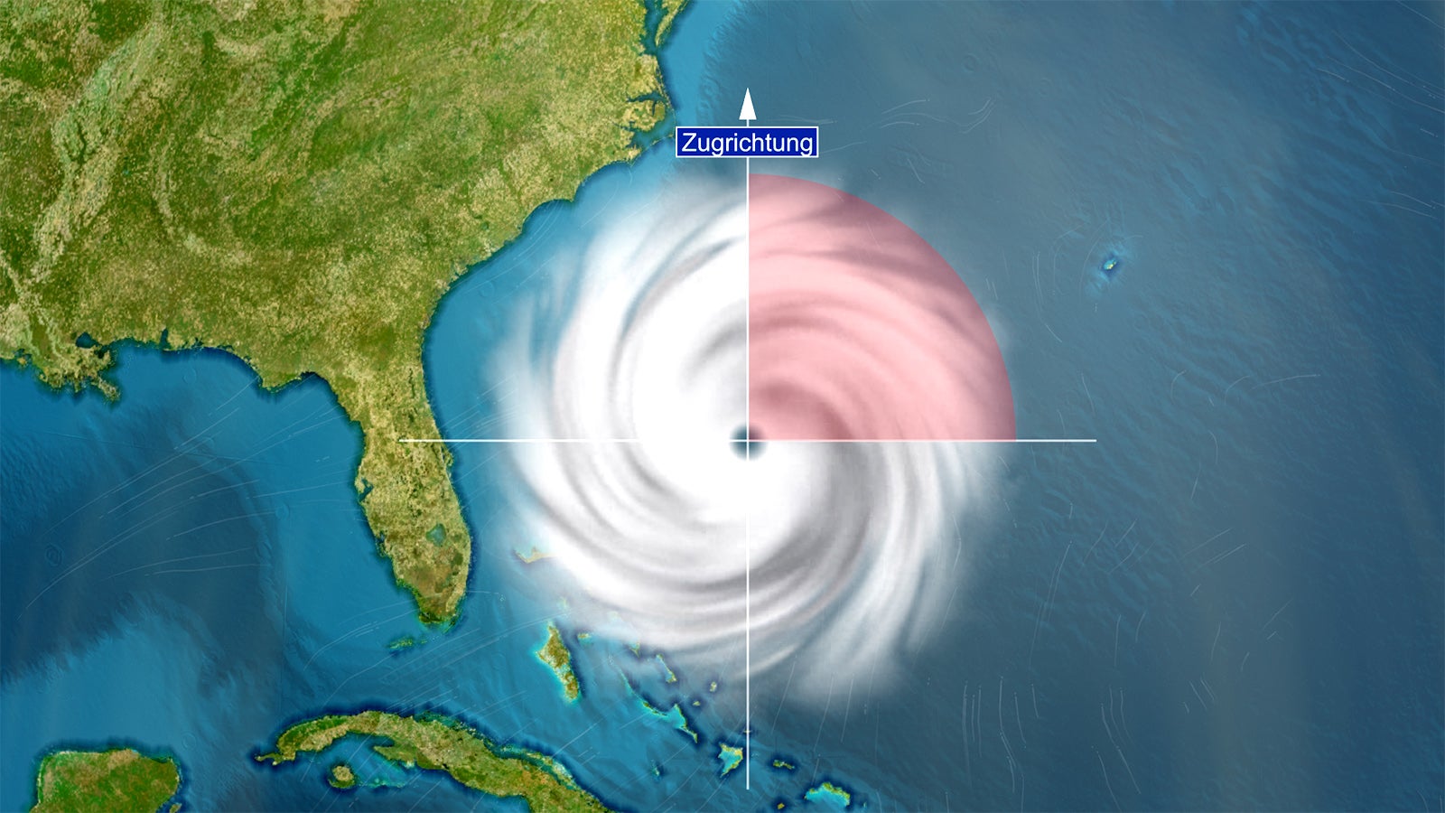 Bei der Vorhersage ist für Meteorologen vor allem die Zugrichtung des Hurrikans wichtig. Denn sie gibt Aufschluss darüber, wo die Gefahr für Menschen am höchsten sein wird. Für die Gefahrenermittlung werden Wirbelstürme dafür in vier Quadranten unterteilt, die immer relativ zur Bewegungsrichtung sind.