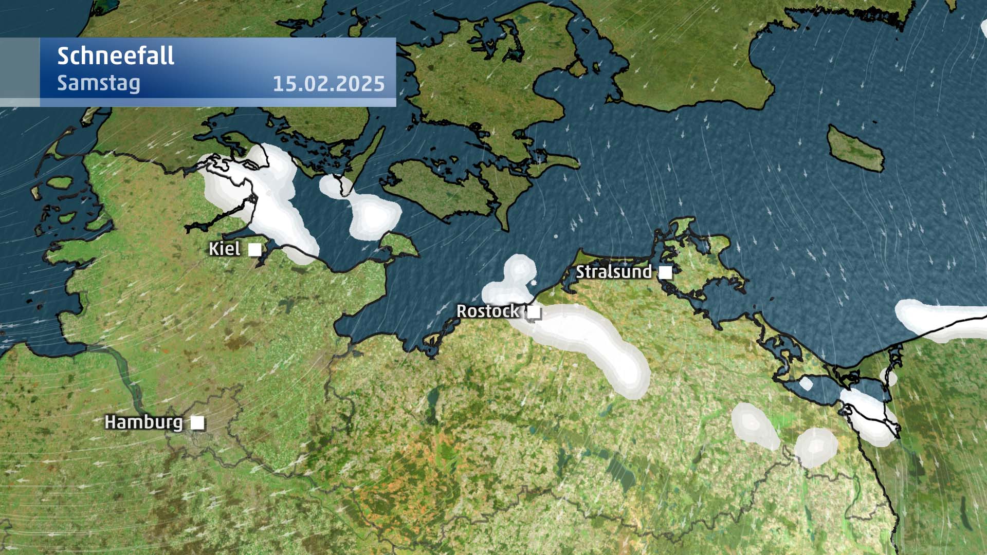 Schon am Freitag gibt es Schneeschauer von der Ostsee. Die Luft ist so kalt, dass sie über dem 2 bis 4 Grad „warmen“ Meerwasser aufsteigt und dann bilden sich Schneeschauer. An Land kann es dann ein paar Zentimeter Schnee geben.