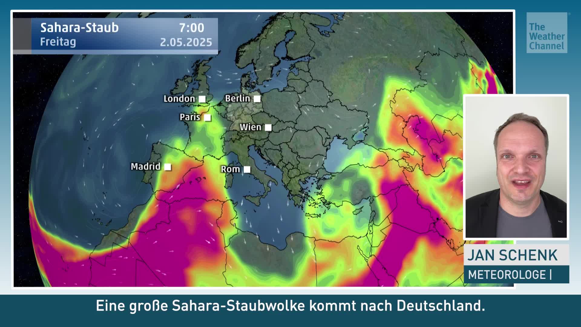 Schon ab Freitag ist der Sahara-Staub in der Luft und kommt bis in die Mitte Deutschlands voran. Am Samstag nimmt der Staub dann schon wieder ab und am Sonntag ist der kaum noch zu sehen.