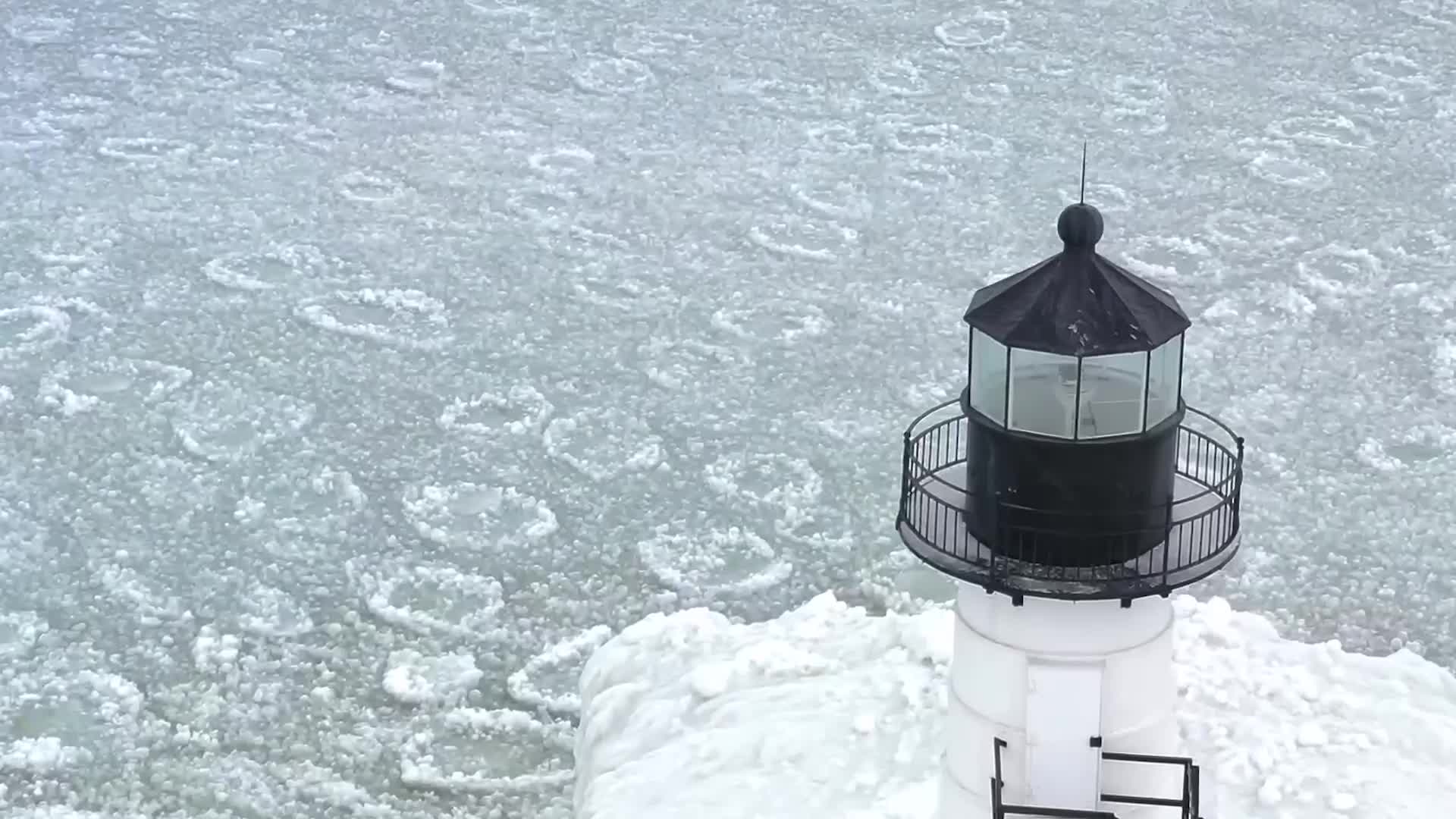 Las impresionantes imágenes de un operador de dron revelaron la transformación helada del Lago Michigan, mientras delicados “nenúfares de hielo” flotaban cerca del faro del North Pier en St. Joseph en temperaturas gélidas.