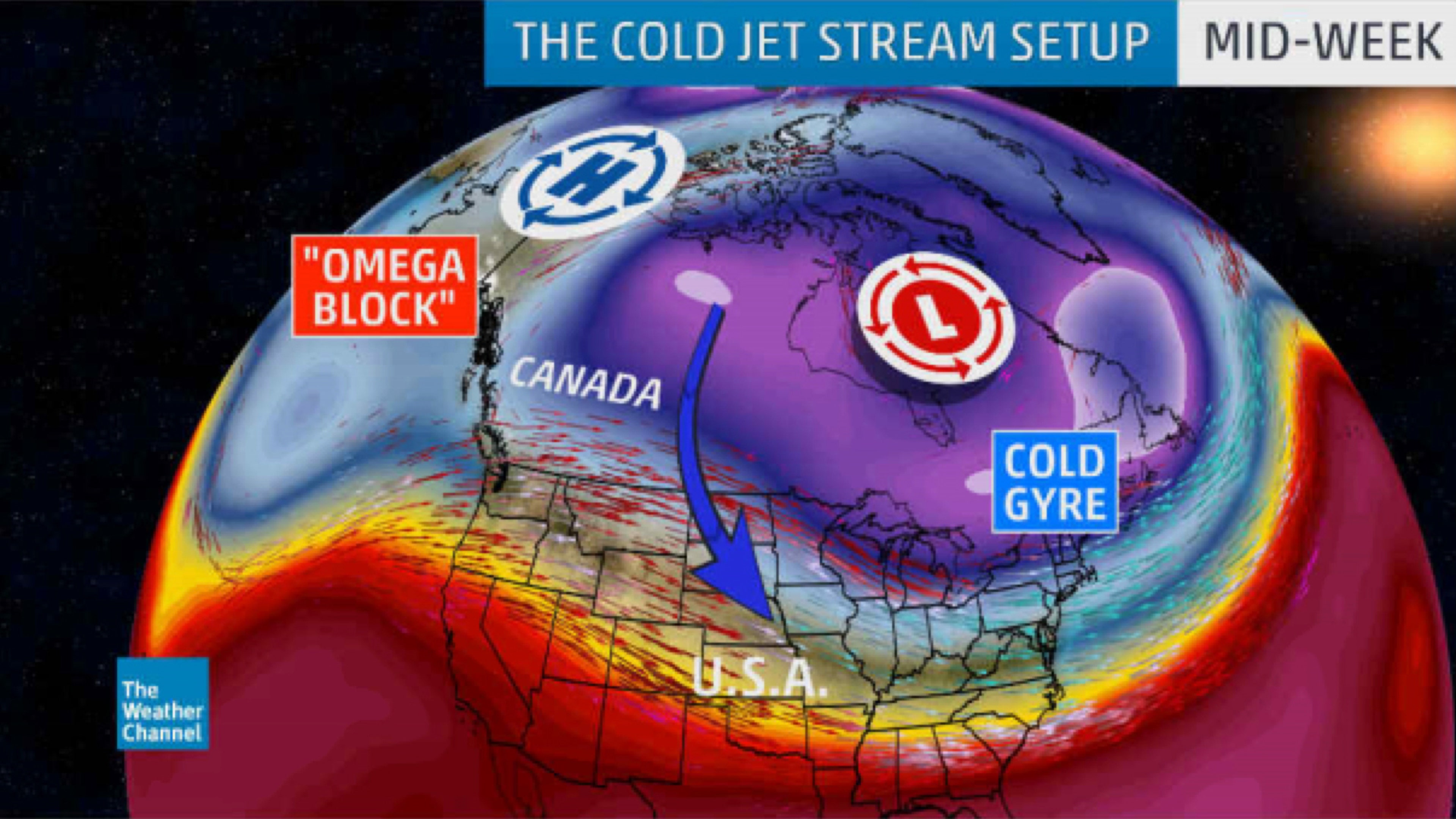 To the east of this atmospheric roadblock, the jet stream is taking a sharp, southward nosedive into the heart of the U.S., acting as a cold-air pipeline from north of the Arctic Circle.