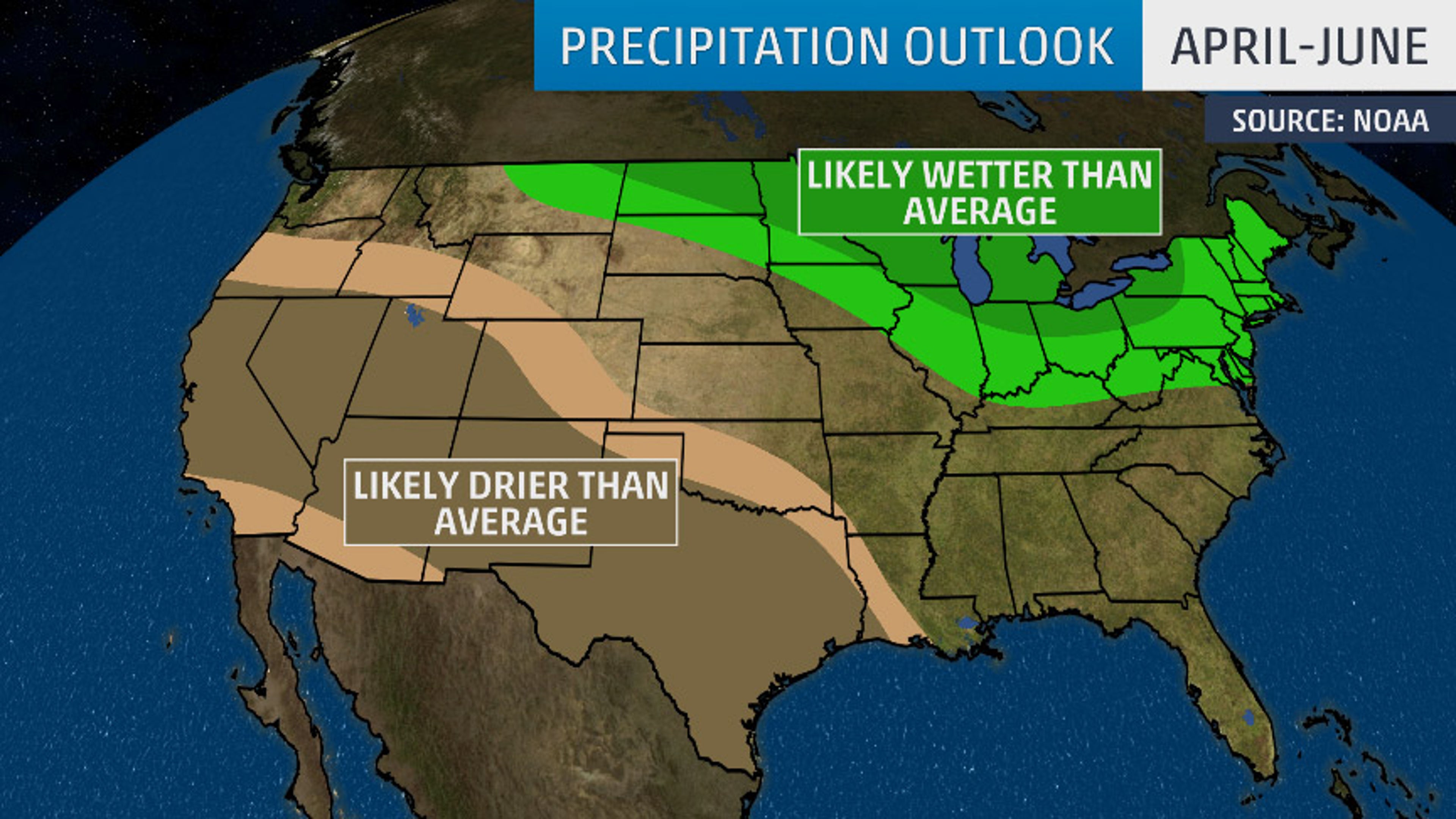 The greatest chance for above-average precipitation exists from the northern Plains eastward to the Great Lakes and Northeast. Areas from the southern Plains into the Southwest are most favored for a drier-than-average spring.