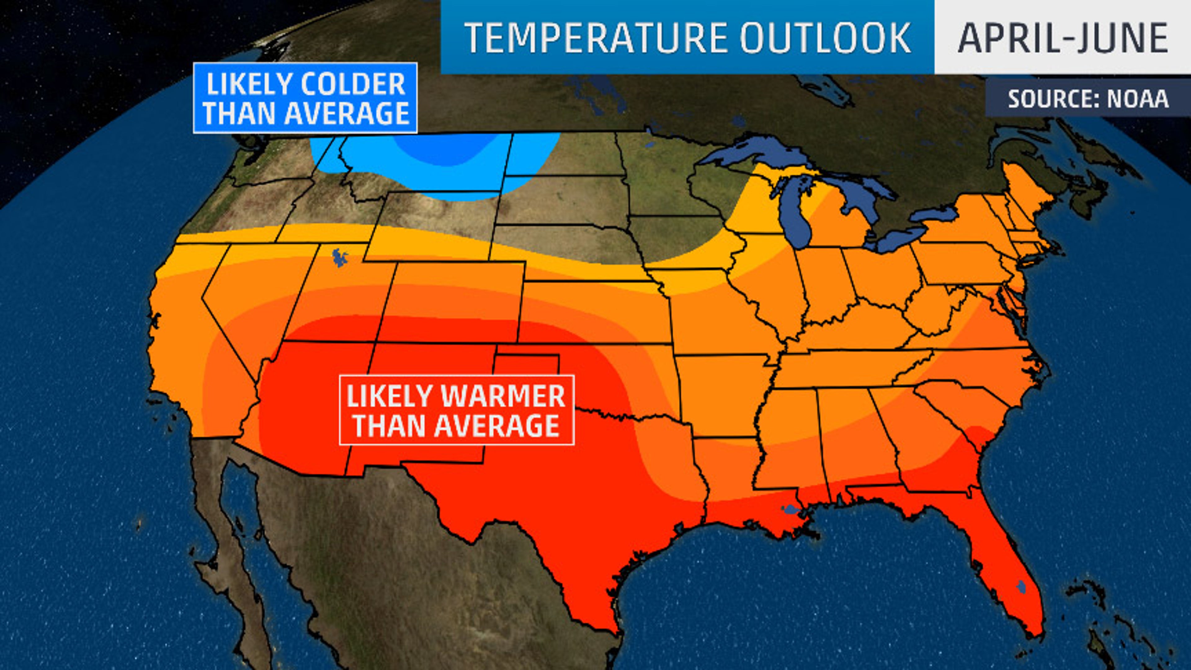 The highest likelihood of warmer-than-average temperatures exists in the Southwest, southern Plains and along the Gulf Coast. NOAA says that the probability of above-average temperatures April-June is somewhat lower in the Ohio Valley, Great Lakes and Tennessee Valley since soil moisture levels are higher than usual in those regions.