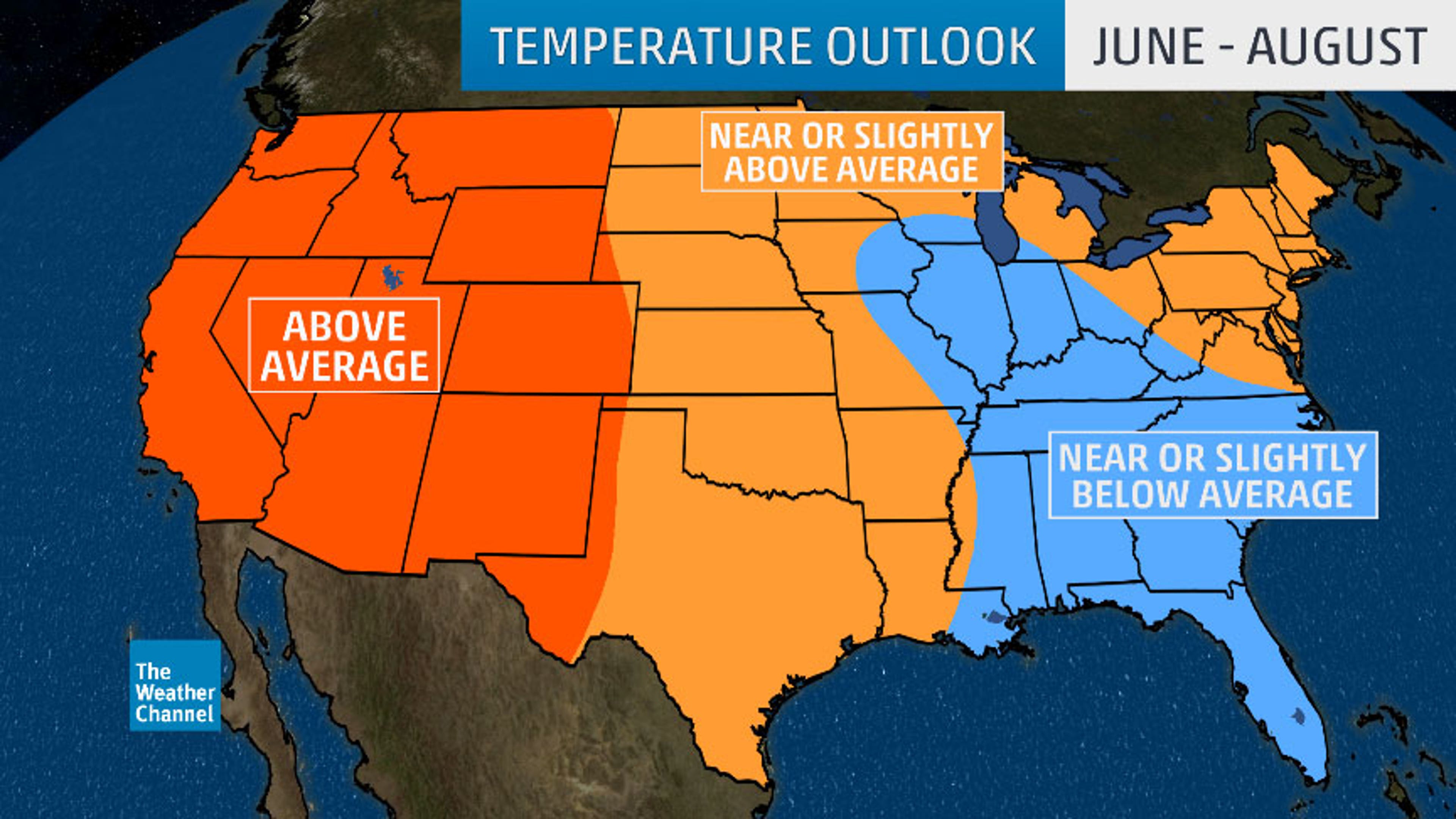 Above-average temperatures are expected to continue to grip the West this summer, while parts of the Southeast and Midwest may see near to slightly cooler-than-average conditions, according to the latest outlook from The Weather Company, an IBM Business.
