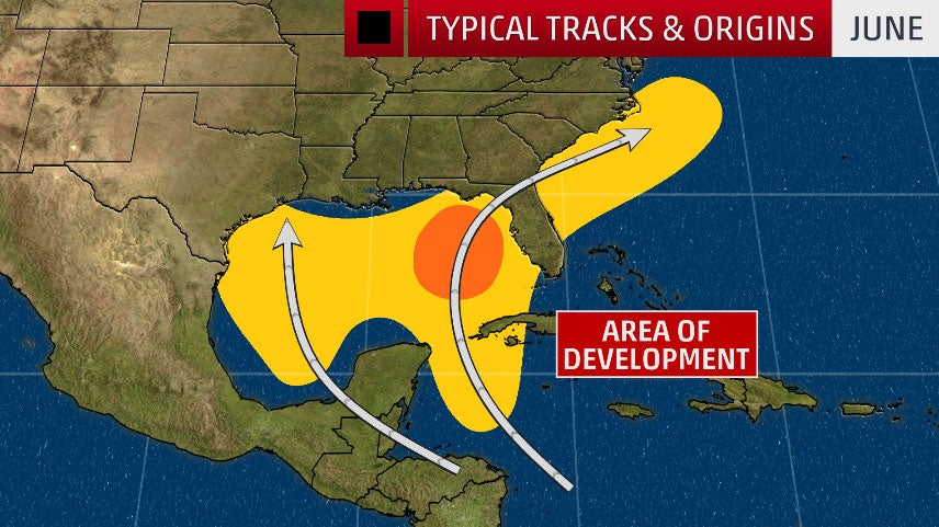 This map shows the typical formation areas and tracks for named storms in June.