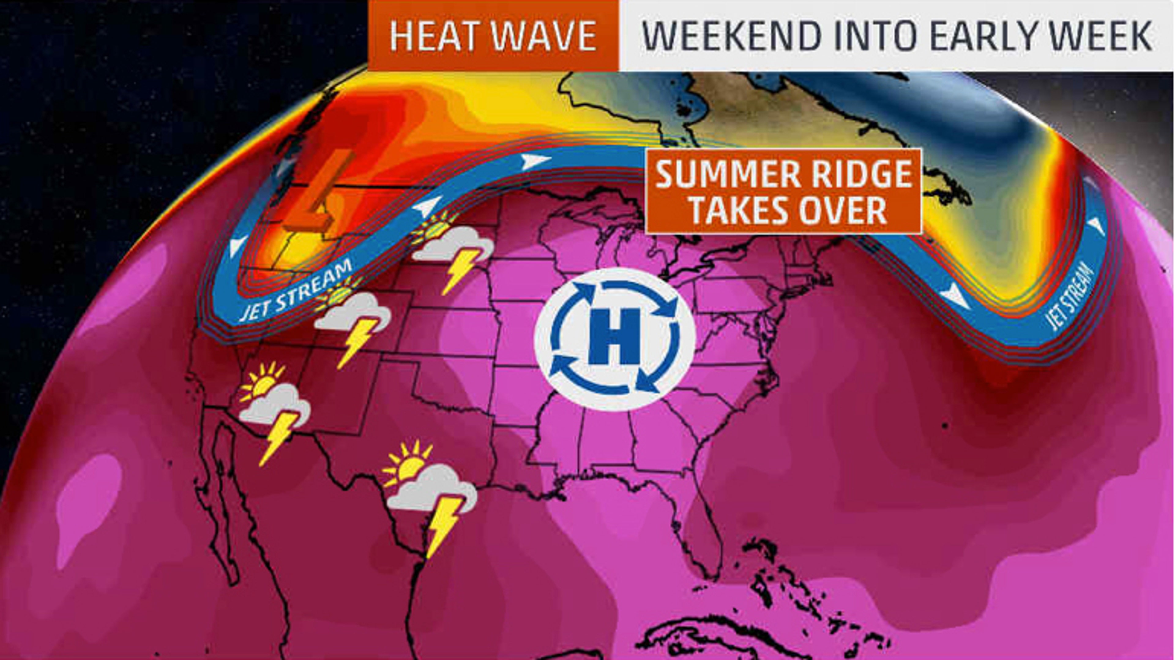 As the jet stream digs southward into the Pacific Northwest, a ridge of high pressure will build over the central and eastern United States, likely bringing the first widespread outbreak of heat and humidity in the Midwest.