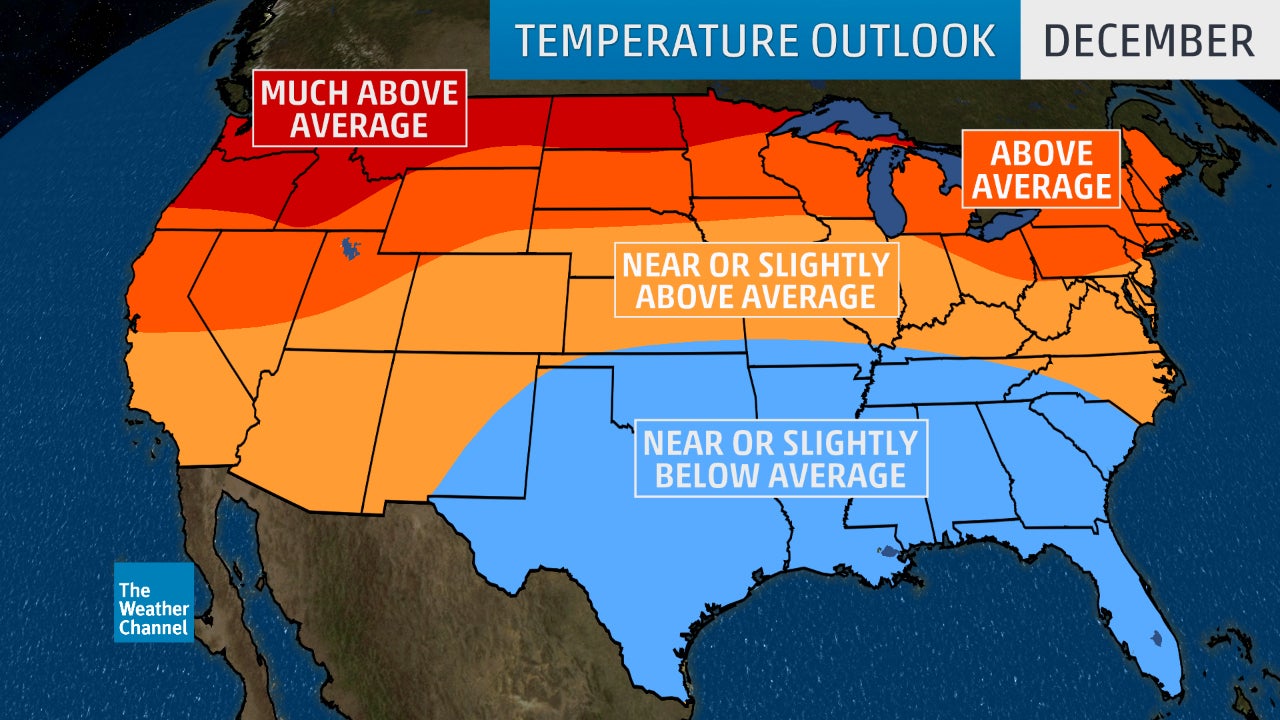 A broad swath from Southern California to the Desert Southwest, southern Rockies, lower Midwest and mid-Atlantic should see temperatures near or slightly above average in December.