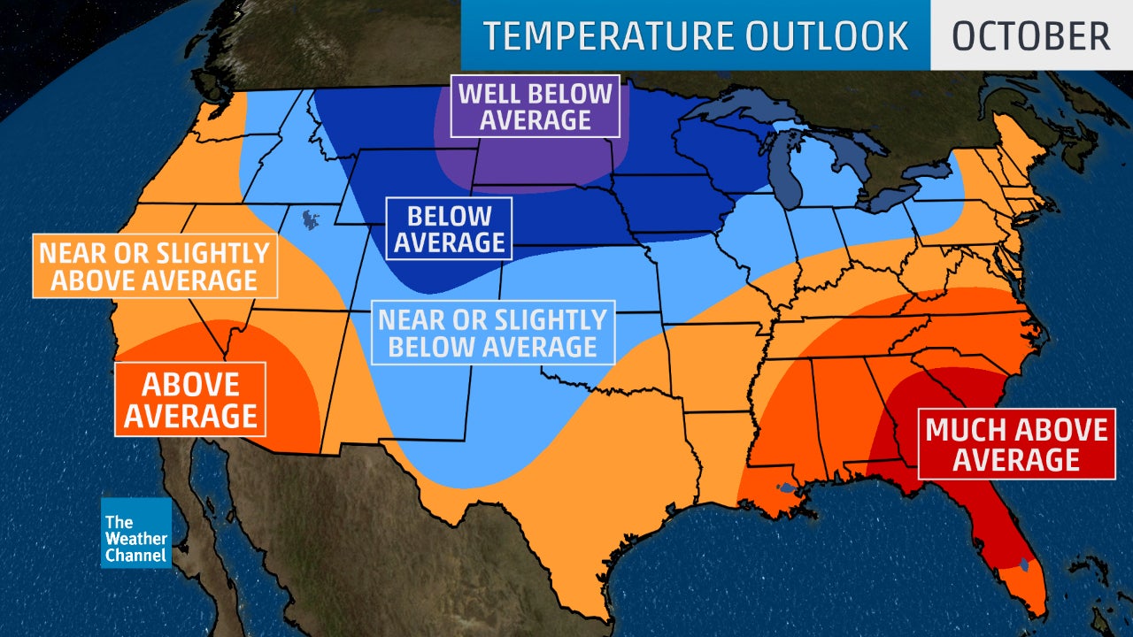 Colder-than-average temperatures are expected in October from the northern Rockies to the northern Plains and upper Midwest, with far below-average temperatures likely in the Dakotas, eastern Montana, northeastern Wyoming and western Minnesota, according to the latest outlook from The Weather Company, an IBM Business.
