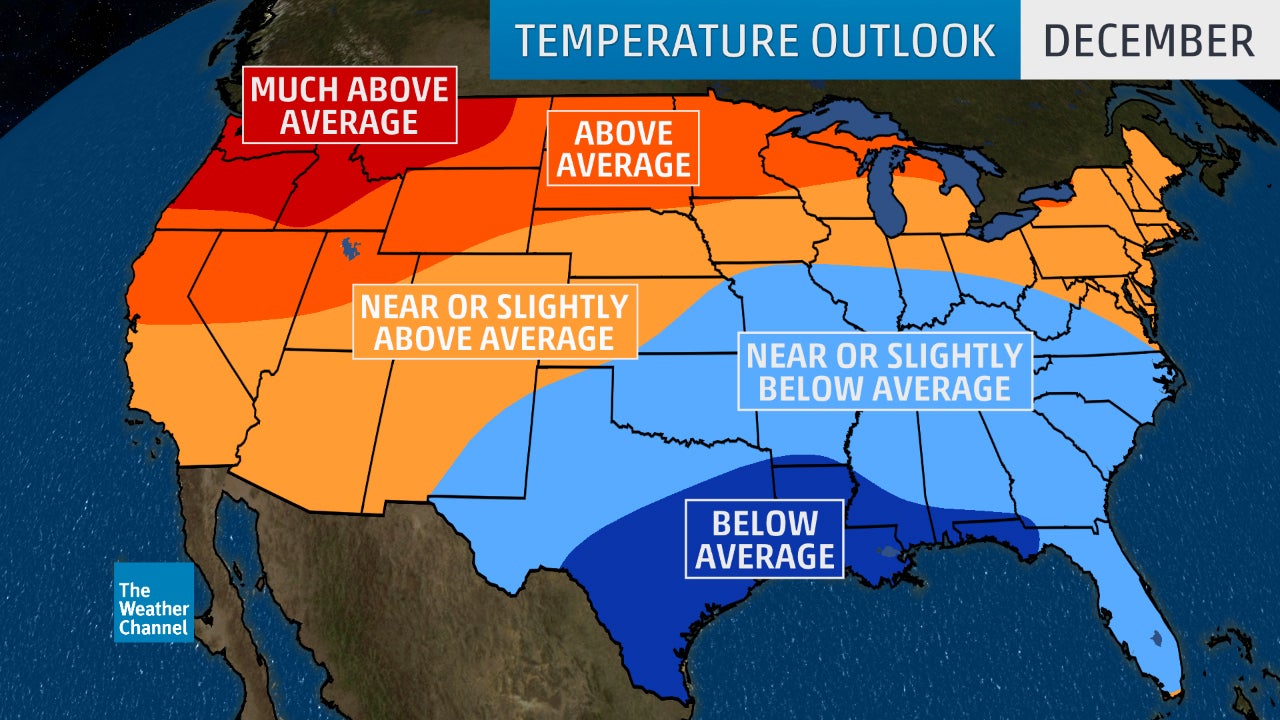 A broad swath from southeastern New Mexico to the southern Plains, mid-Mississippi Valley, lower Ohio Valley, Appalachians and Southeast should see temperatures near or slightly above average in December.