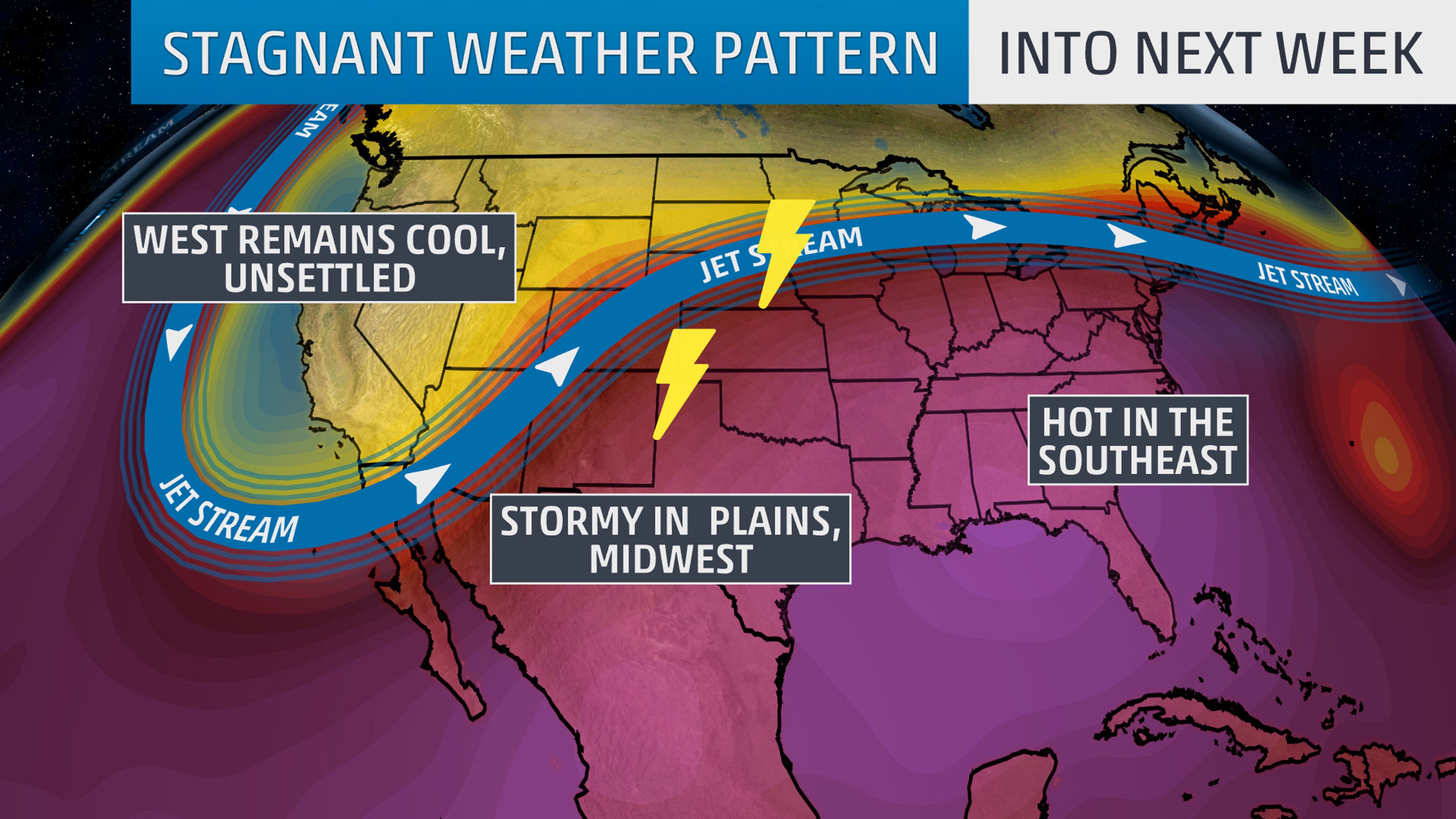 That stuck jet-stream pattern means the weather conditions you can expect from coast to coast are generally locked in through the rest of this week and into next week.
