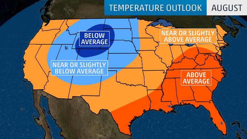 Temperatures in August are expected to be farthest above average from the mid-Atlantic and Ohio Valley into the South, similar to what has occurred in much of those regions so far in July.