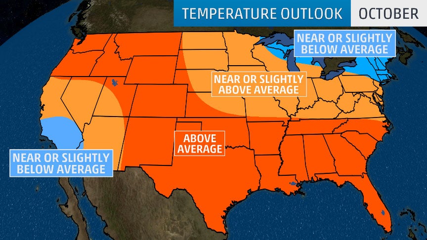 Elsewhere, much of the Northwest and South are also forecast to see warmer-than-average conditions in October. The Northeast and Southern California could see temperatures that are somewhat below average.