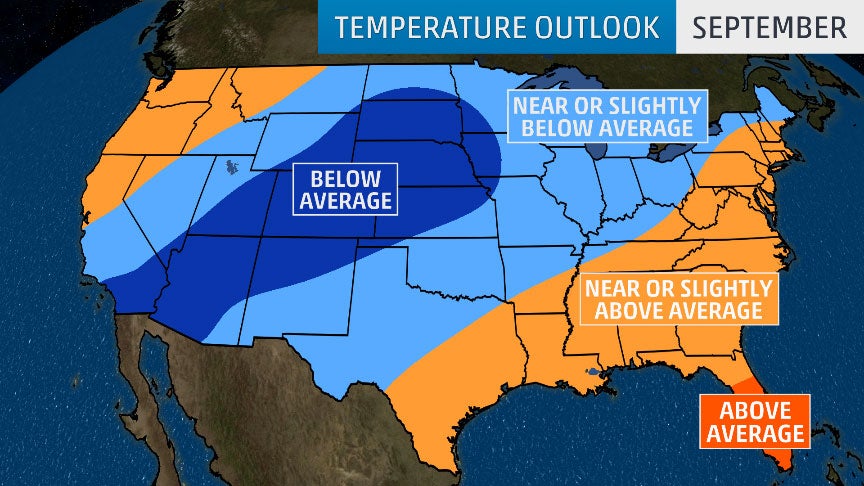 For now, computer model forecast guidance indicates that an area from the Southwest into the Rockies and Plains has the highest odds of experiencing below-average temperatures in the first month of fall. Much of the East, South and Northwest could see temperatures near or slightly above average.