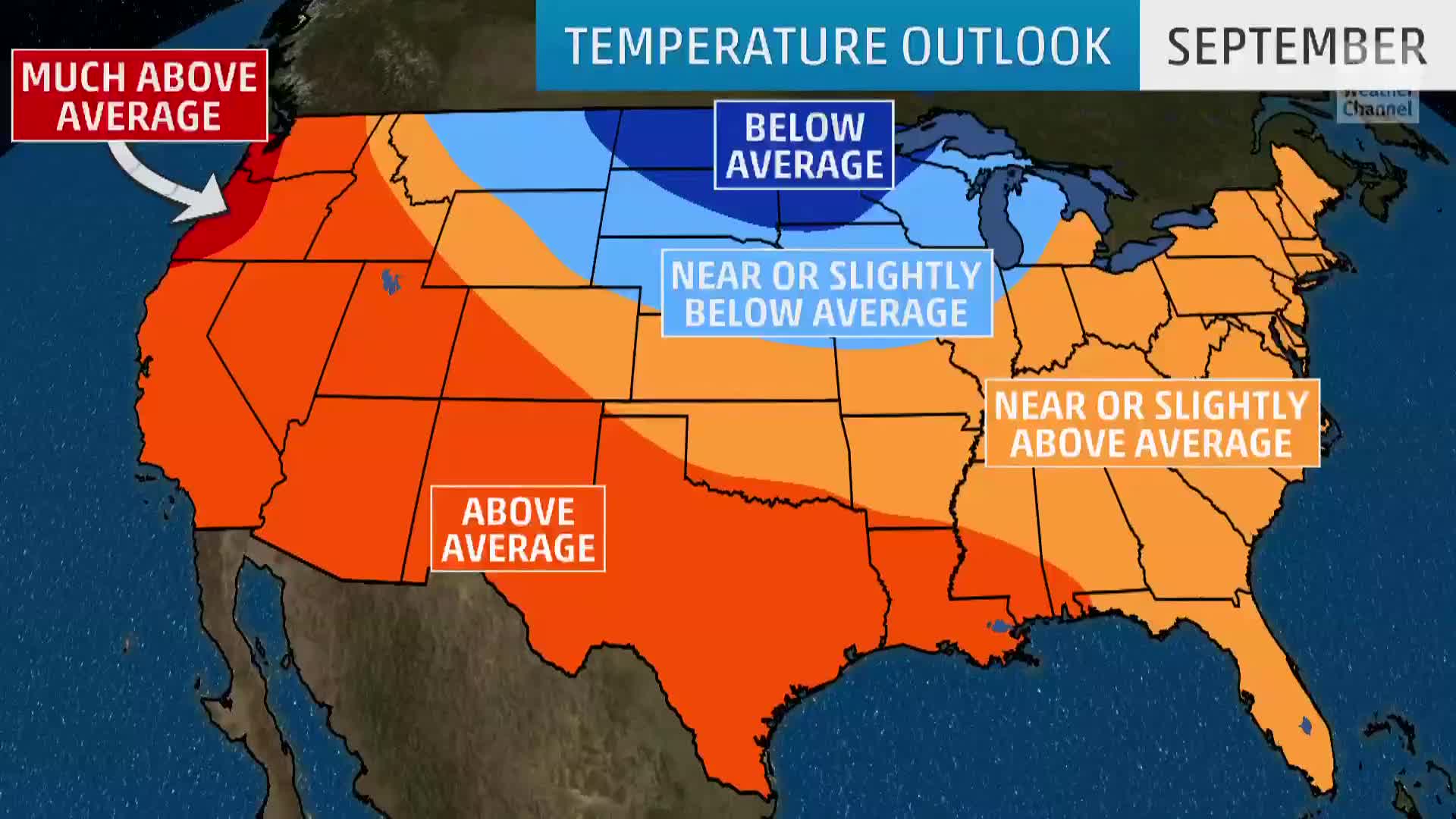 An area from the south-central states to the West Coast has the highest odds of above average temperatures in September. Much warmer than average temperatures could grip the Pacific Northwest.