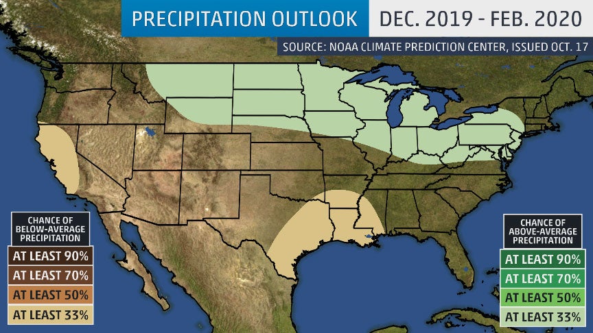 NOAA also released its winter outlook on Thursday and highlights an area from the Northern Plains into parts of the mid-Atlantic and Northeast as having an above-average chance of seeing more precipitation than average this winter. This includes areas of the Northern Plains and Midwest that have already experienced well-above average precipitation and record flooding this year.