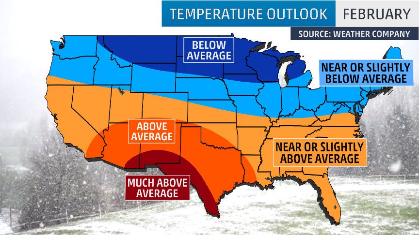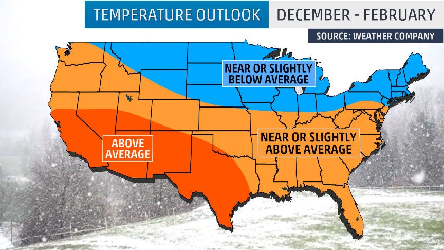 December through February temperature outlook from The Weather Company, an IBM Business.